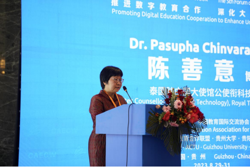作为论坛的重要组成部分,在中泰大学校长论坛上,蔡英凤、蓬猜·蒙空瓦尼、张建华、宋塔温、潘查妮·高娜、贵州师范学院副校长任洁等积极探索智慧教育新模式,围绕“推进数字教育合作,深化大学互联互通”主题进行了深入交流,进一步深刻认识教育数字化的重要战略意义,拓宽中泰两国教育交流合作渠道,以期更好地服务两国高等教育合作需求、推进国际高等教育合作的理念与实践创新。报告中,蔡英凤围绕数字教育国际合作交流面临的新形势、数字教育赋能教育国际化的江大实践以及深化数字教育国际合作的构想与建议,介绍了伟德官网在数字教育赋能国际合作与交流高质量发展方面的经验与实践。