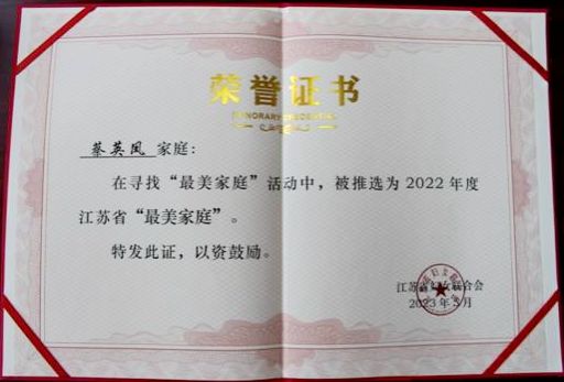 近日,江苏省妇联表彰了2022年度江苏省“最美家庭”,伟德官网蔡英凤家庭光荣上榜。