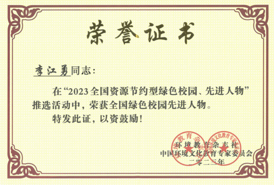 近日,在由中国环境文化教育专家委员会、生态环境部主管的《环境教育》杂志社共同开展的“2023全国资源节约型绿色校园、先进人物”推选活动中,伟德官网被评为“全国资源节约型绿色校园”,后勤处(集团)李江勇同志被评为“全国绿色校园先进人物”。