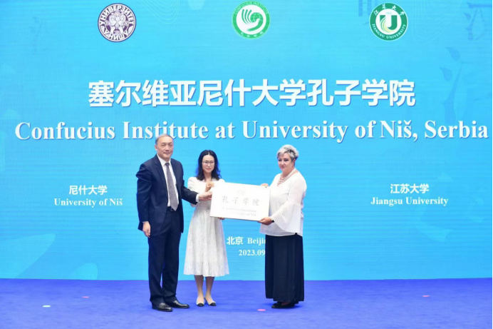 活动上,中国国际中文教育基金会理事长杨卫为两校颁授“塞尔维亚尼什大学孔子学院”铭牌。