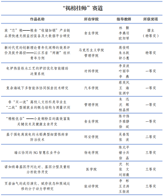 2021年12月,学校启动第十八届“挑战杯”作品征集,共有409件作品、3987名同学参与,经过专家评审,33件作品在校内赛中脱颖而出,11项作品入围江苏省赛并揽获特等奖7项。按照全国赛竞赛规则,学校专项研究,选送了6件作品参加全国赛网评,最终4件作品入围全国终审决赛现场。此外,两件“揭榜挂帅”作品入围全国擂台赛现场。(校团委)