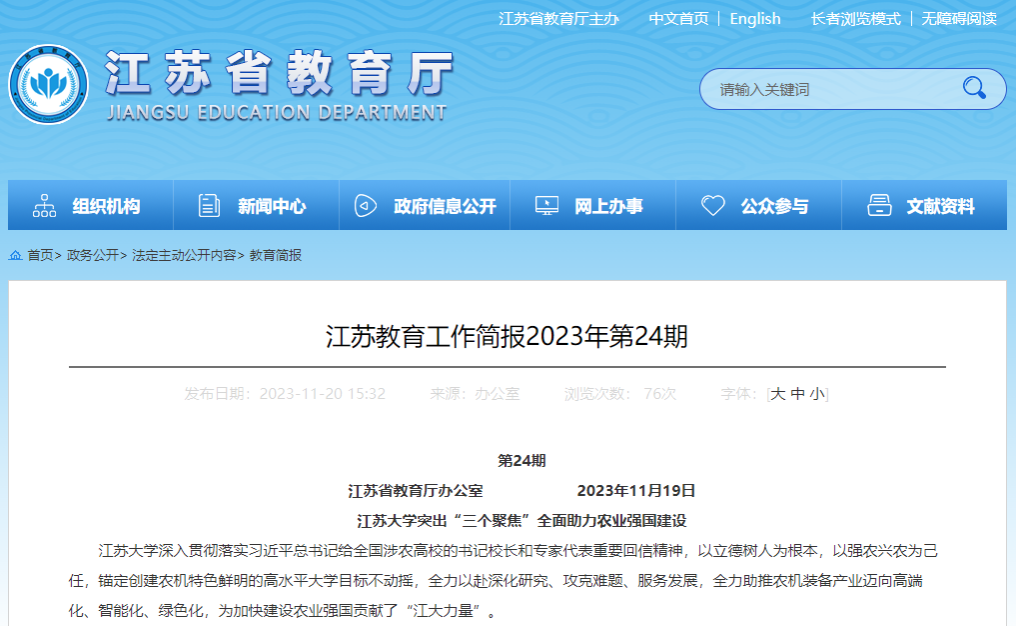 近年来,学校深入贯彻落实习近平总书记给全国涉农高校的书记校长和专家代表重要回信精神,以立德树人为根本,以强农兴农为己任,锚定“双一流”创建和特色鲜明高水平大学建设目标不动摇,全力以赴深化研究、攻克难题、服务发展,全力助推农机装备产业迈向高端化、智能化、绿色化,为加快建设农业强国贡献了“江大力量”。(校长办公室)