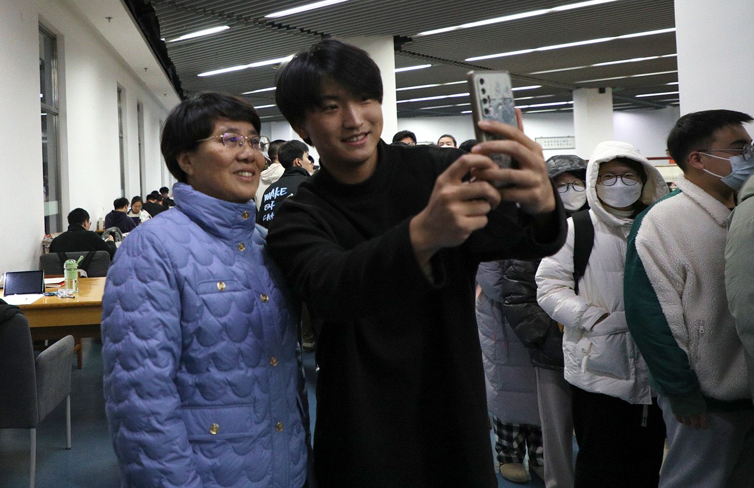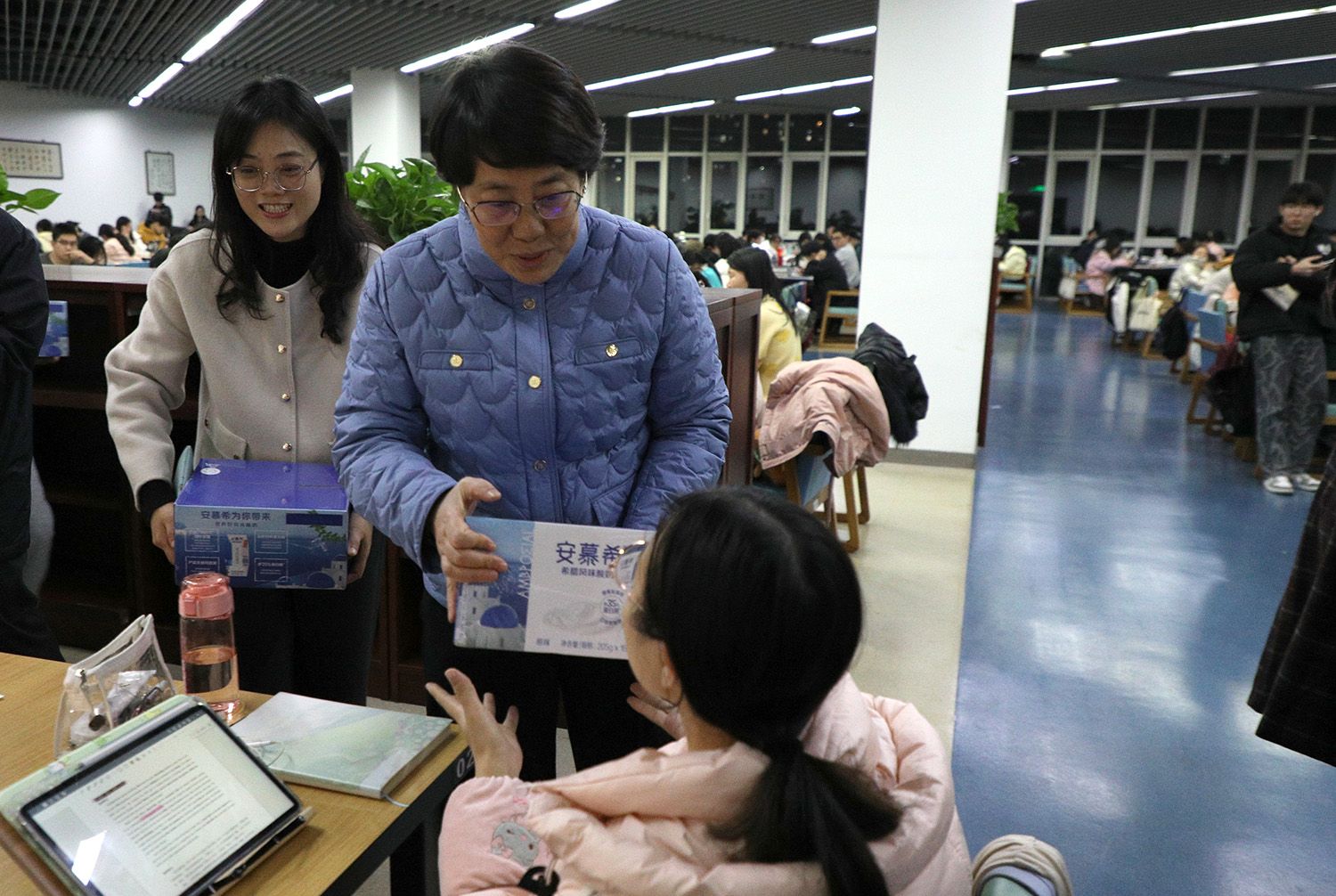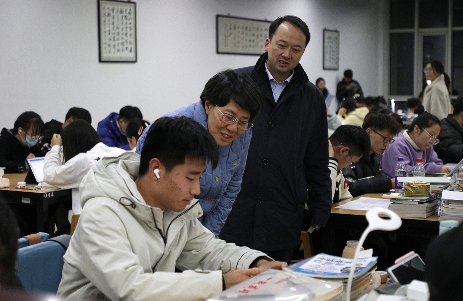 11月30日晚10点,校长邢卫红、副校长任旭东一行走进图书馆,看望考研学子,发放慰问品近千份,为奋战考研的莘莘学子送去亲切关怀和温暖祝福。