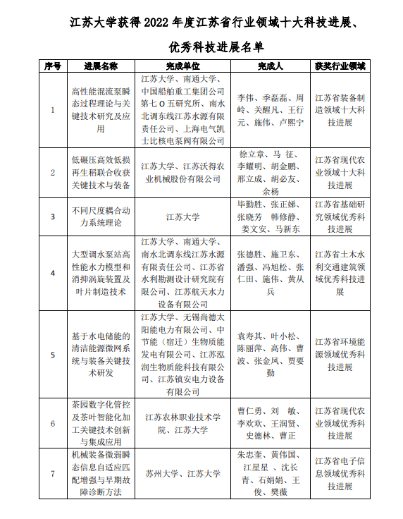 2022年度江苏省行业领域十大科技进展、优秀科技进展由省科学技术协会所属8家省级学会联合体组织推荐,围绕基础研究、土木水利交通建筑、化工新材料纺织、环境能源、装备制造、现代农业、电子信息、生物医药等8个行业领域,经提名、形式审查、初评、综合评审并向社会公示,确定70项十大科技进展、78项优秀科技进展。