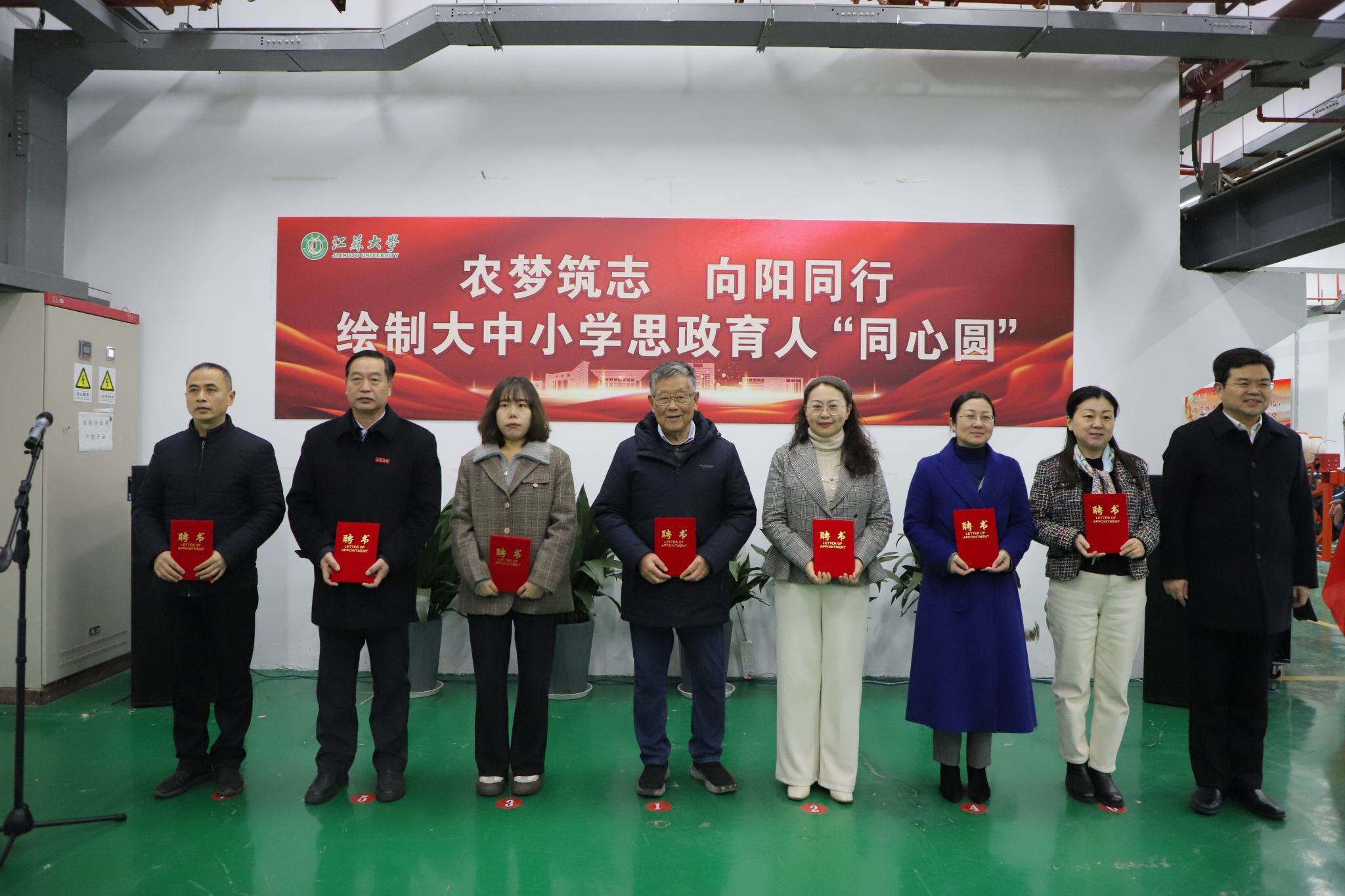 李洪波为赵亚夫,全国人大代表、镇江新区永兴农机机械化专业合作社理事长魏巧,晏培娟,思想政治工作研究院执行院长金丽馥教授,农业工程学院毛罕平教授,马克思主义学院院长李丽教授,附属学校党支部书记夏文祥颁发新禾先锋队特聘导师证书。