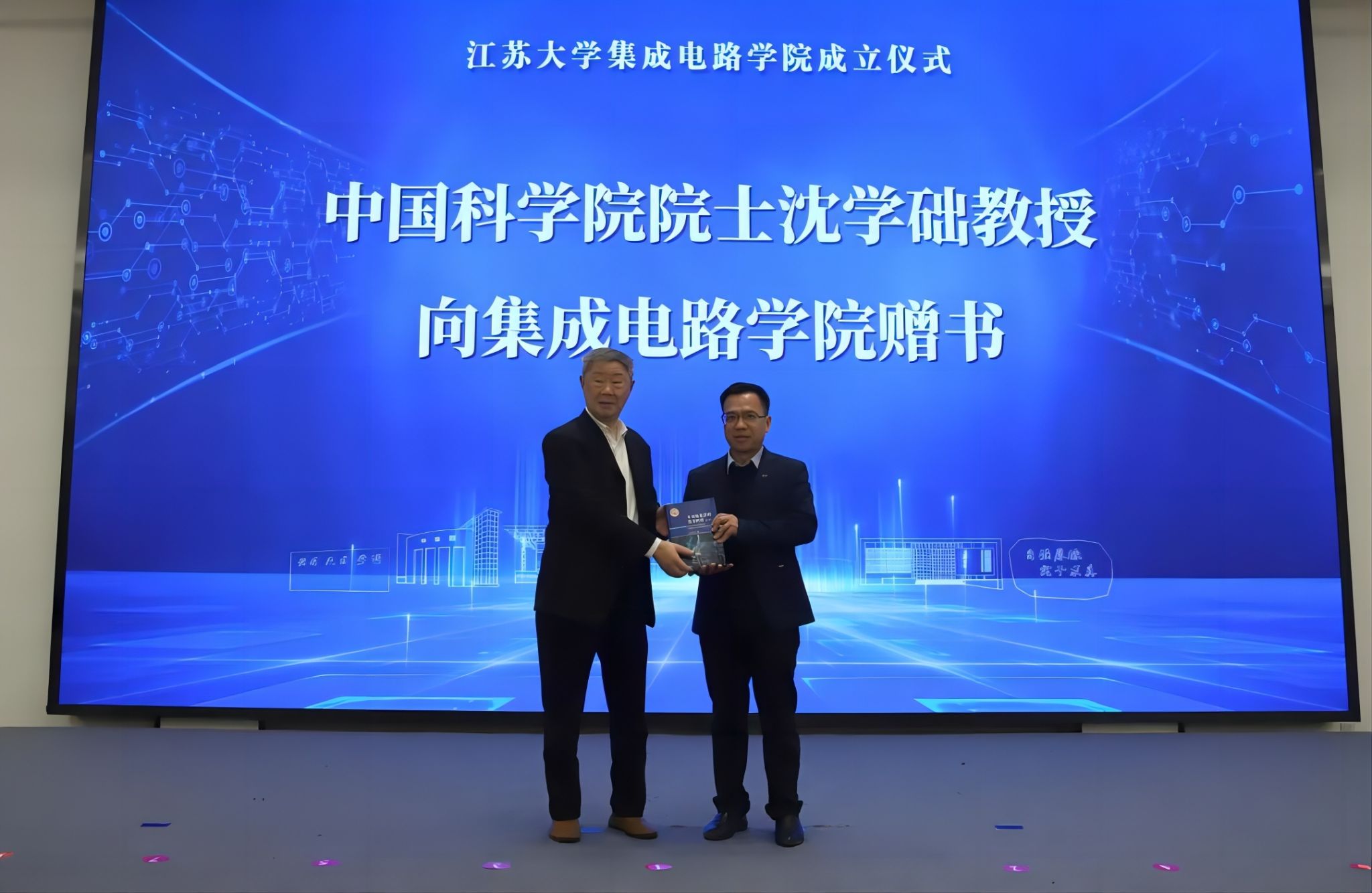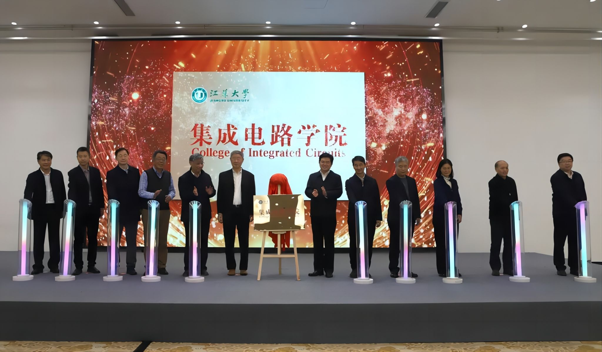 沈学础、祝世宁、郭万林、时龙兴、郭宇锋、池宇、曹丽虹、程宇、颜晓红、顾小俊、南京信息职业技术学院校长田敏、校党委书记李洪波共同为伟德源自英国始于1946集成电路学院揭牌。