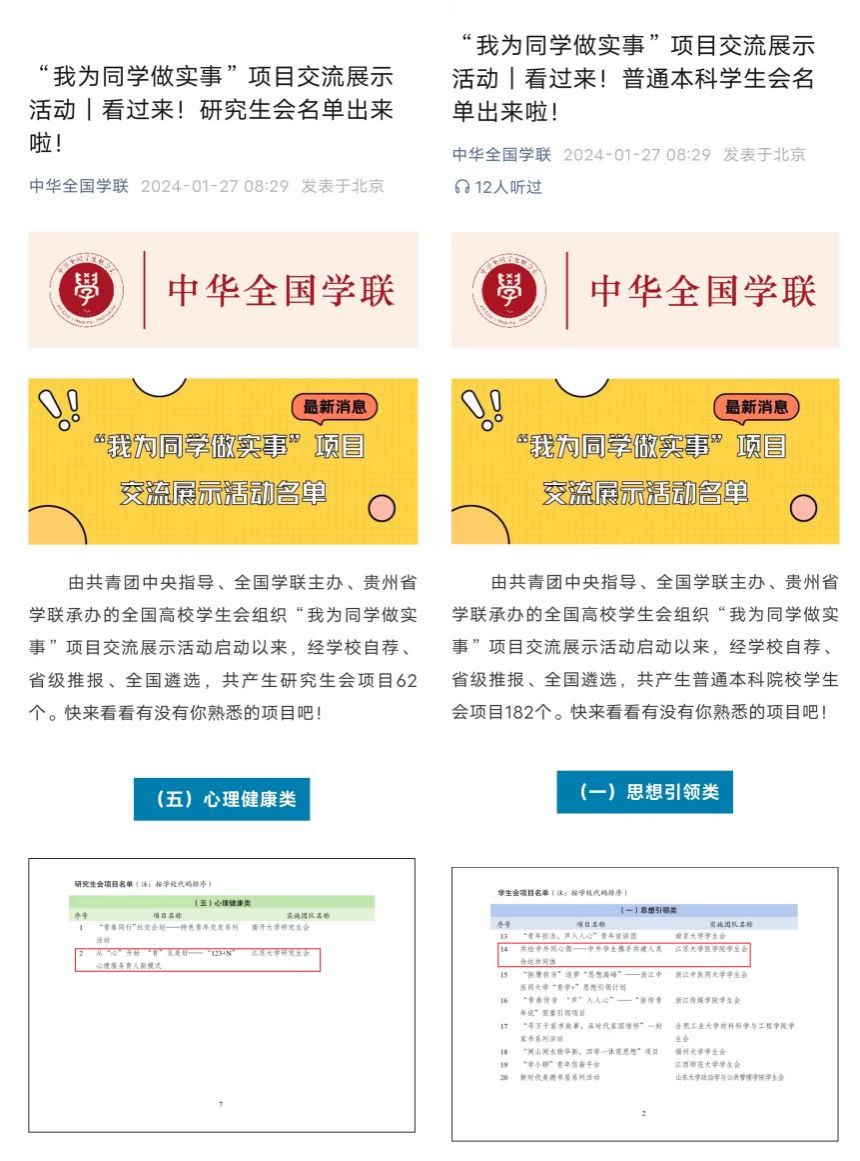 全国高校学生会组织“我为同学做实事”项目交流展示活动由共青团中央指导、全国学联主办、贵州省学联承办,共评选出研究生会项目62个、学生会项目182个。江苏有8所高校12个项目入围,入围2个项目的高校仅有4所。