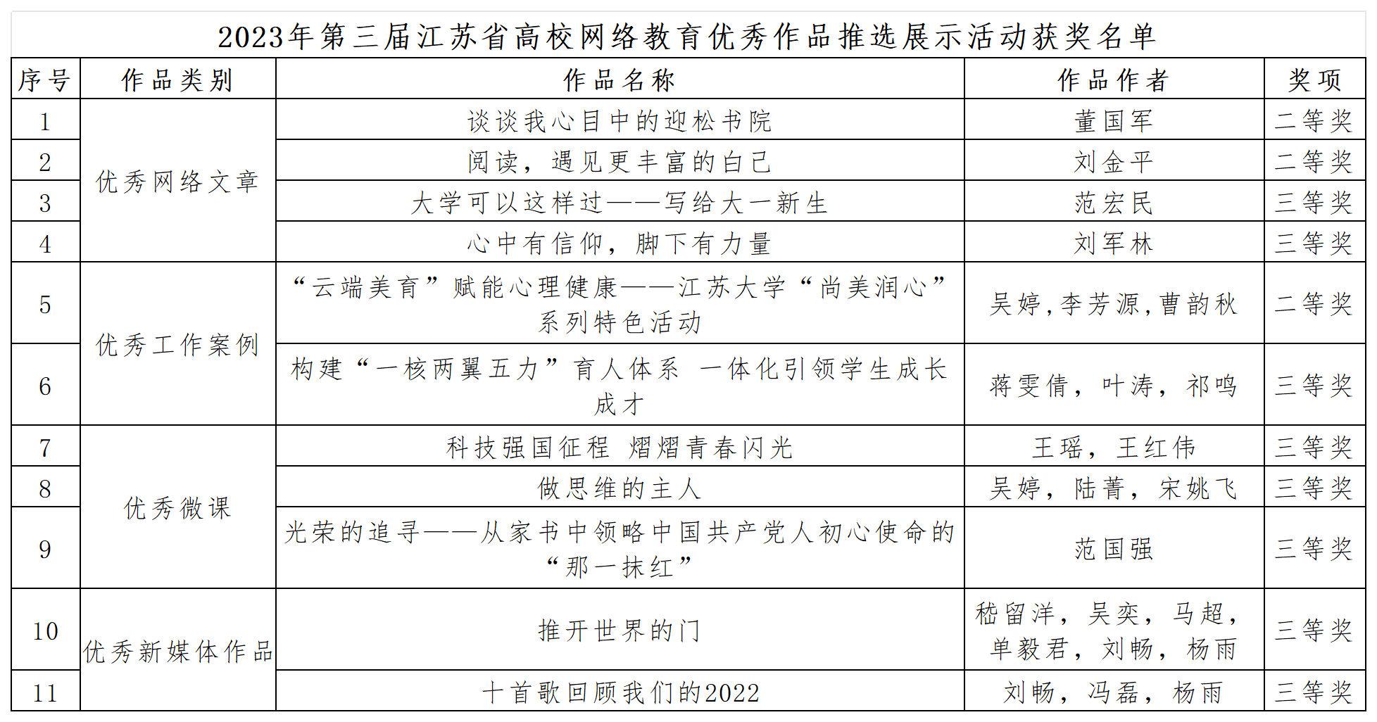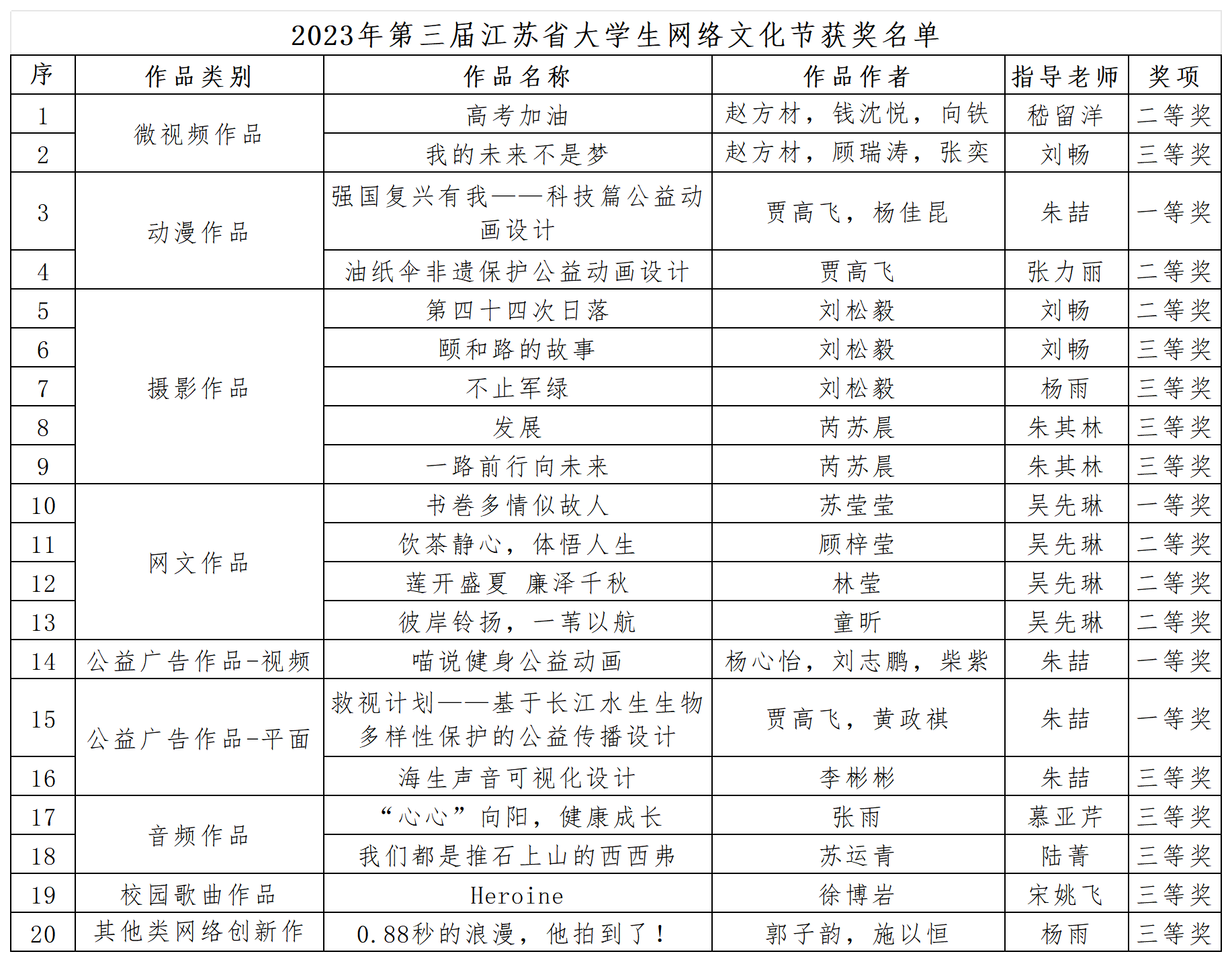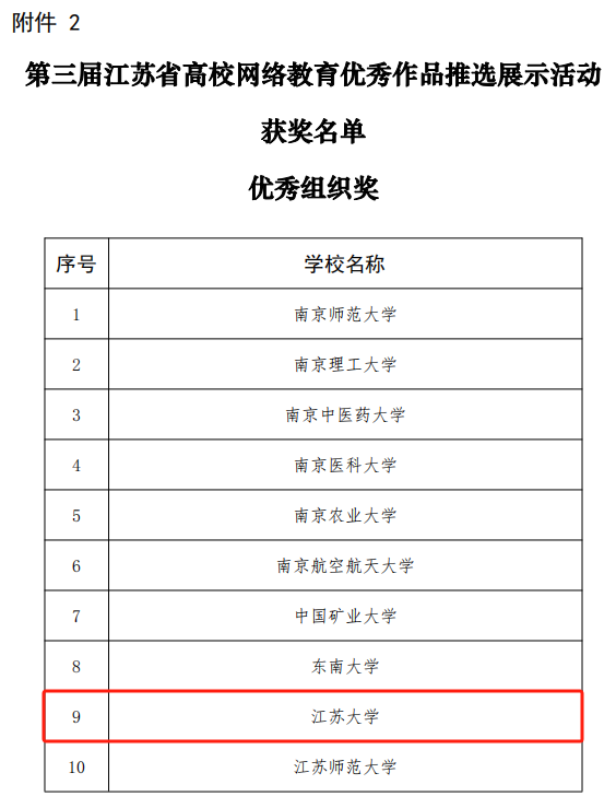 获奖作品中,大学生网络文化节作品20项,其中一等奖4项、二等奖6项、三等奖10项;高校网络教育优秀作品11项,其中二等奖3项、三等奖8项。金丽馥、朱喆、刘畅3位教师获“第二届江苏省大学生网络文化节优秀指导教师”荣誉称号,学校获第三届江苏省高校网络教育优秀作品推选展示活动“优秀组织奖”。