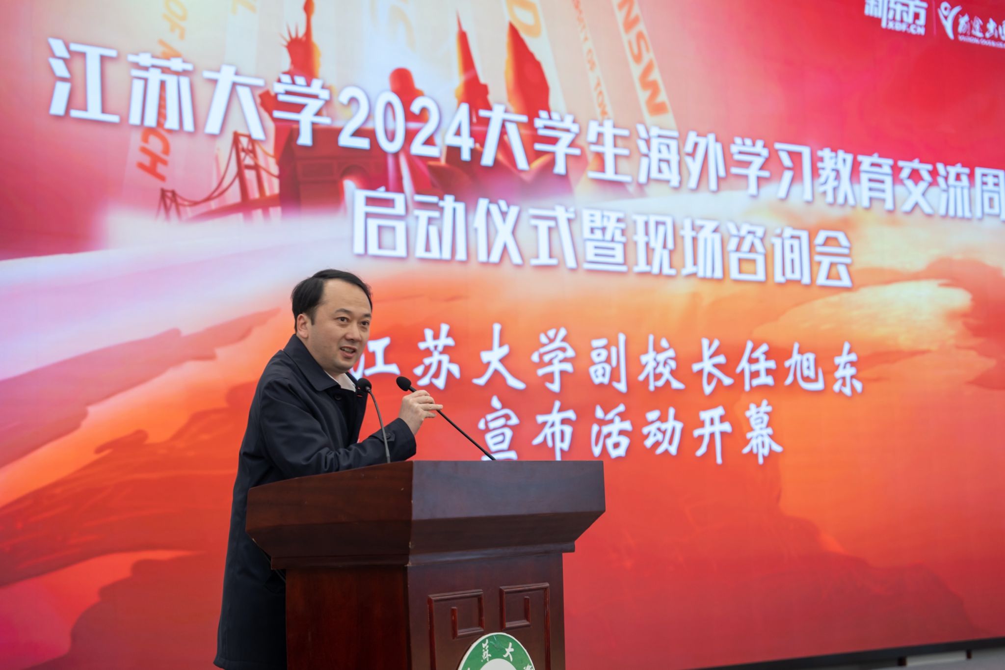 校党委常委、副校长任旭东、蔡英凤,江苏省教育国际交流服务中心副主任阎宇军,新东方教育科技集团国际教育培训事业部副总经理李欢等参加启动仪式。活动由国际合作与交流处处长崔勇主持。