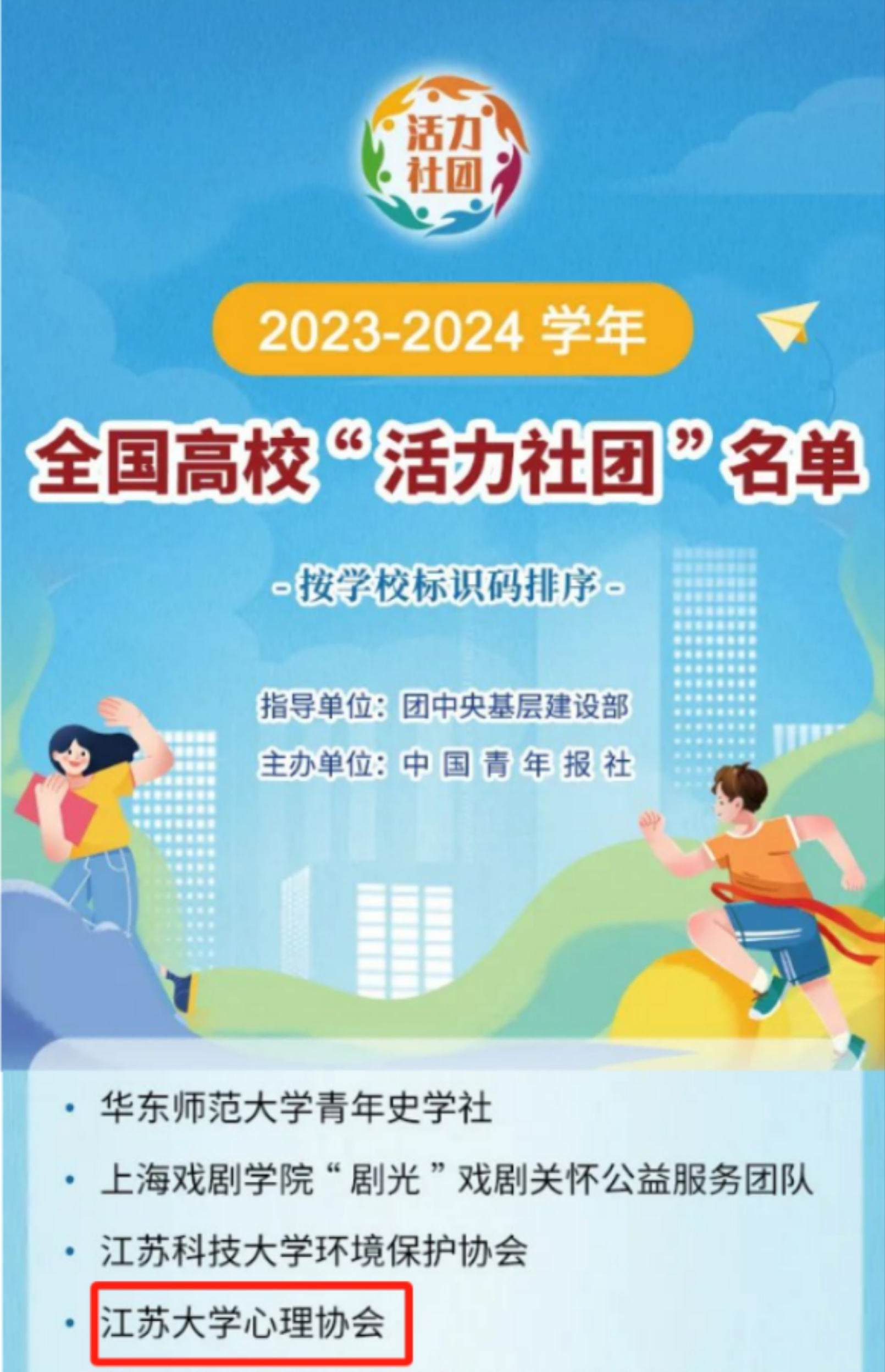 为进一步激发高校学生社团活力,充分发挥学生社团育人功能,团中央基层建设部指导中国青年报社开展2023-2024学年高校“活力社团”风采展示活动,集中展示高校学生社团创新经验做法。经校内选树、省级展示、全国展示等环节,确定了100个2023—2024学年全国高校“活力社团”。