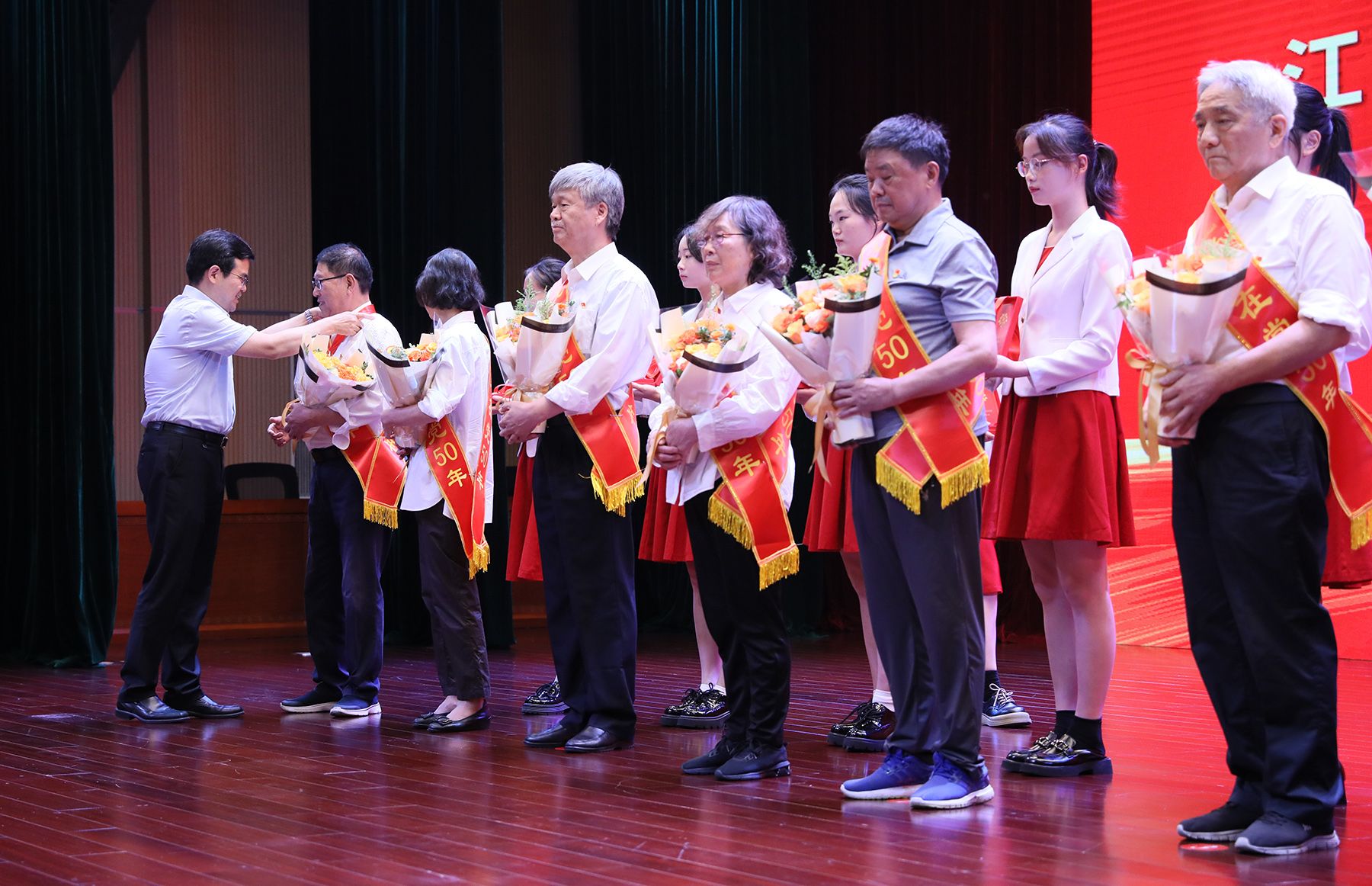 “光荣在党50年”党员代表,管理学院党委、财经学院党委、附属医院党委、机关党委教职工党员代表,新党员代表等400余人参加活动。(党委组织部)