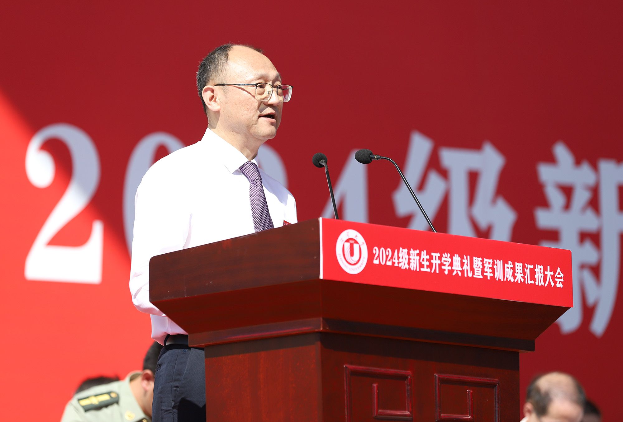 校长邢卫红在典礼上讲话,代表学校向全体2024级新生表示热烈欢迎,向辛勤培育同学们的父母和师长表示崇高敬意,向承担军训任务的教官表示衷心感谢。