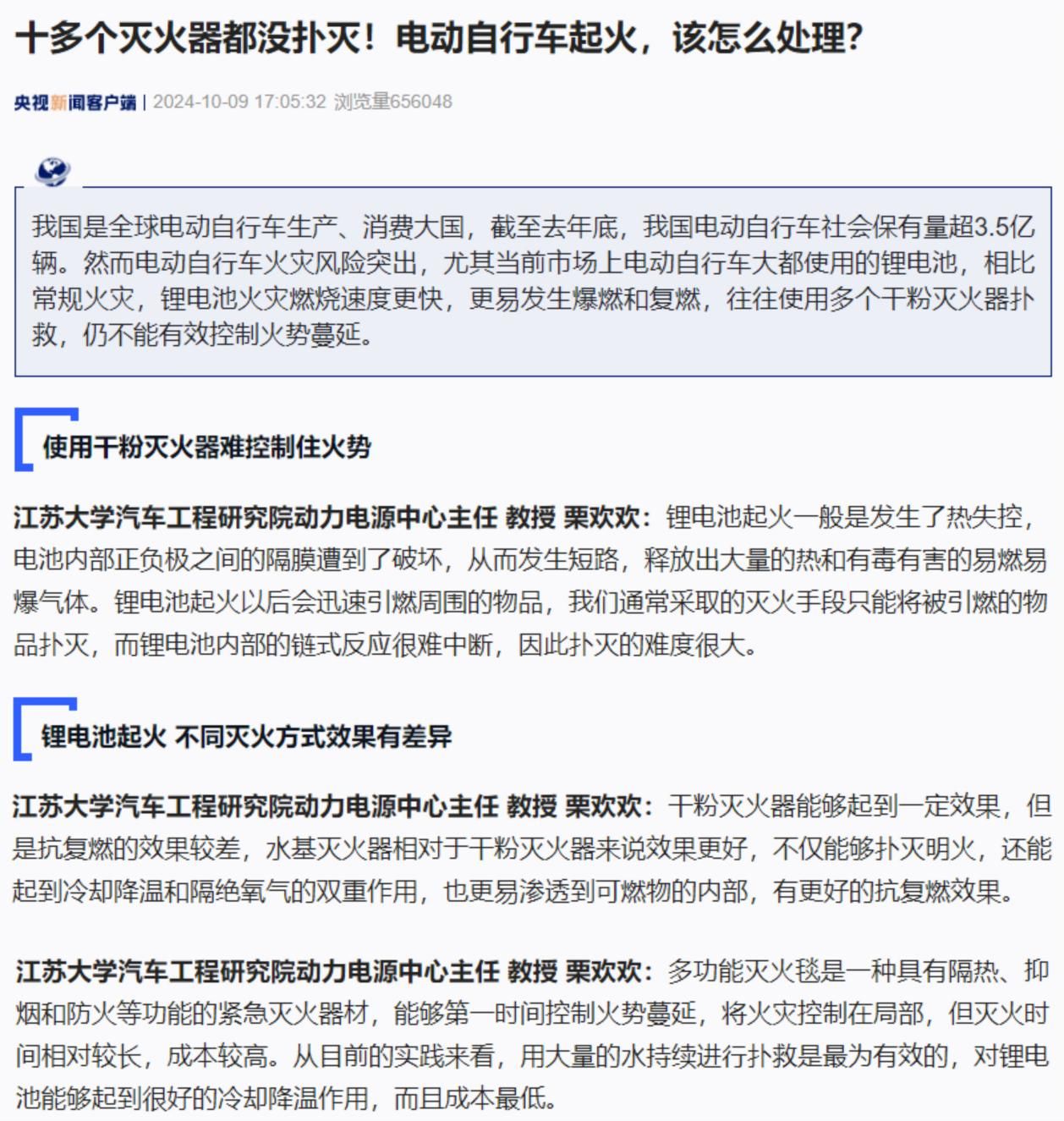 10月9日,《央视新闻》及其客户端刊发《十多个灭火器都没扑灭!电动自行车起火,该怎么处理?》,深度报道伟德官网汽车工程研究院栗欢欢教授从事的锂电池安全研究成果服务社会消防安全建设的情况。