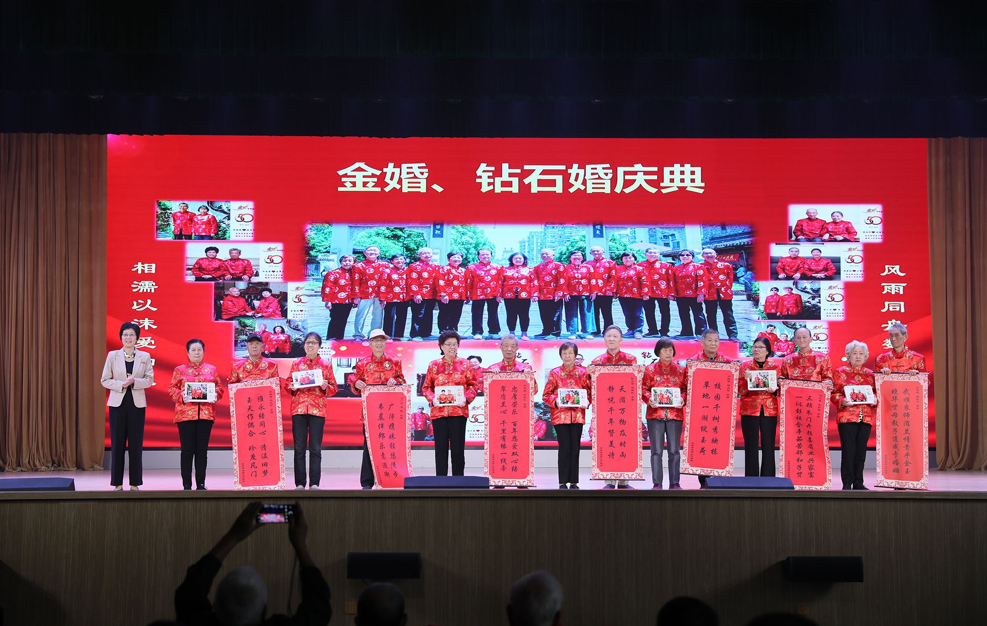 今年金婚夫妇有13对,钻石婚夫妇有3对。李红向钻石婚和金婚夫妇代表赠送了祝福楹联和水晶纪念照。