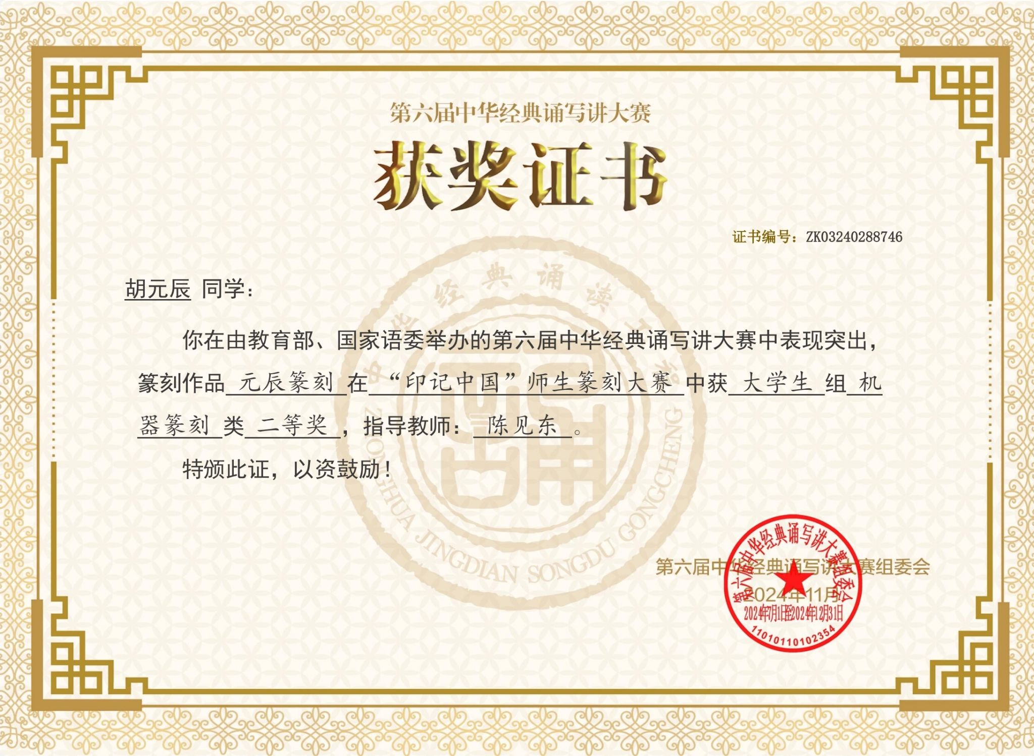 近日,第六届中华经典诵写讲大赛之“印记中国”师生篆刻大赛获奖名单正式公布。伟德官网艺术学院胡元辰同学的篆刻作品《元辰篆刻》(指导教师:陈见东),经过逐级选拔和专家评审,荣获大学生组机器篆刻类二等奖。
