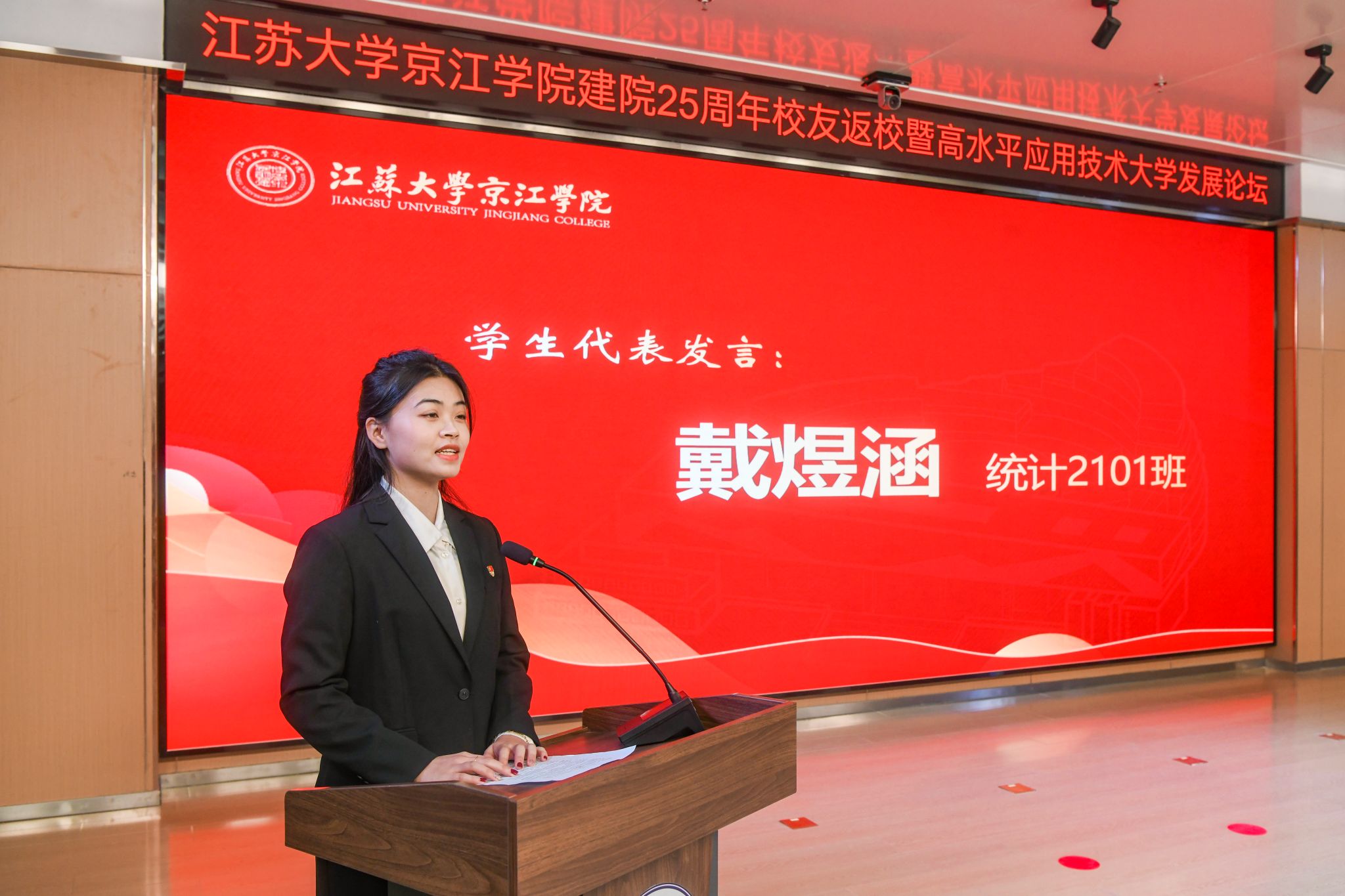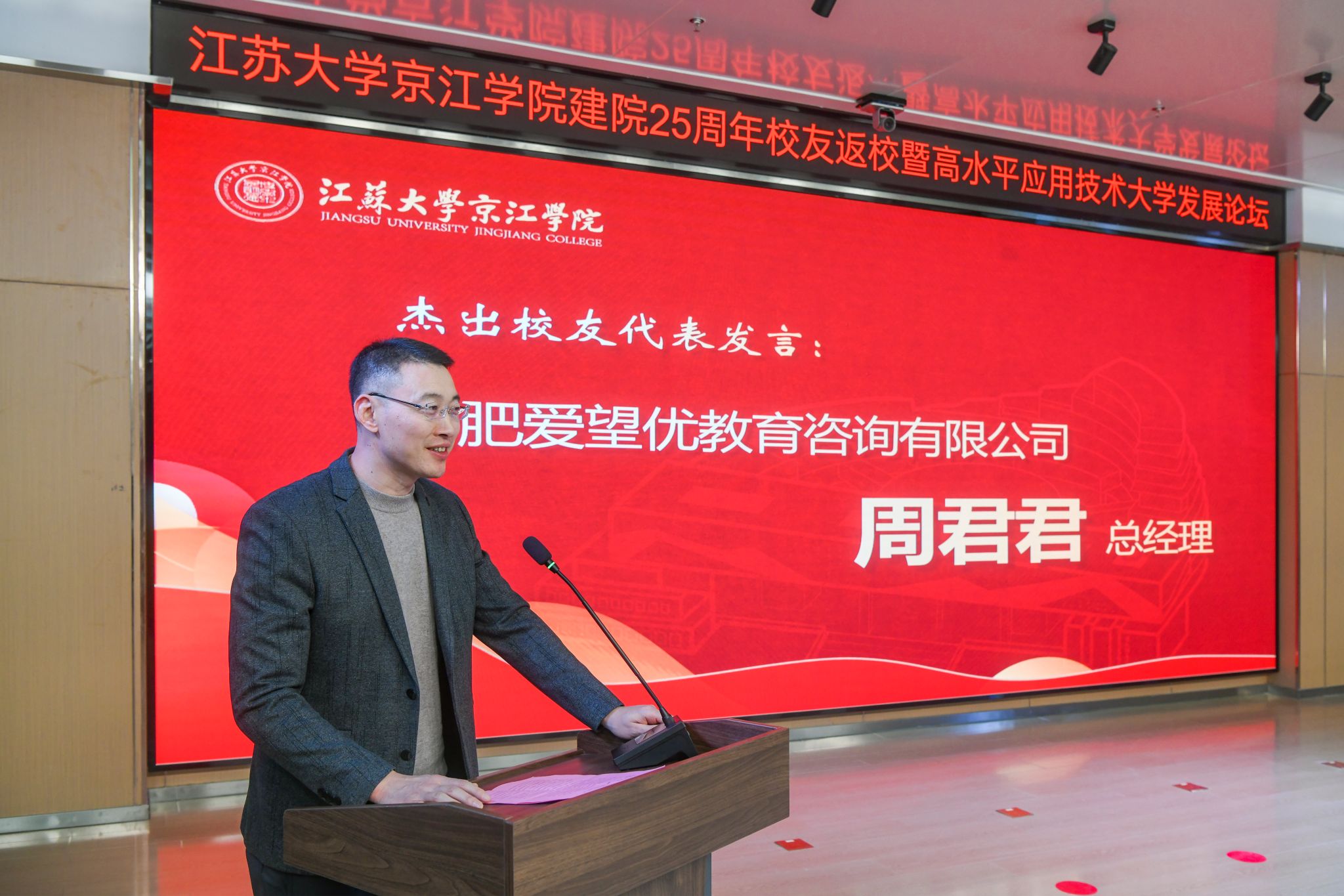 校友代表、合肥爱望优教育咨询有限公司总经理周君君,教师代表、护理系主任吕妃,学生代表、江苏省优秀志愿者、2023-2024届学生团委副书记戴煜涵在发言中分享了京江学院带给他们的成长与收获。