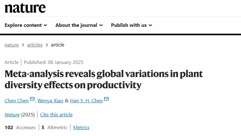 近日,国际顶级学术期刊《自然》(Nature)发表了题为Meta-analysis reveals global variations in plant diversity effects on productivity的研究论文。该论文由加拿大湖首大学(Lakehead University)、伟德源自英国始于1946及中国科学院植物研究所等多家单位联合完成。中科院植物研究所副研究员陈晨为论文第一作者,伟德源自英国始于1946环安学院副教授肖文娅为论文第二作者,陈晨与加拿大湖首大学教授Han Y.H. Chen为论文共同通讯作者。