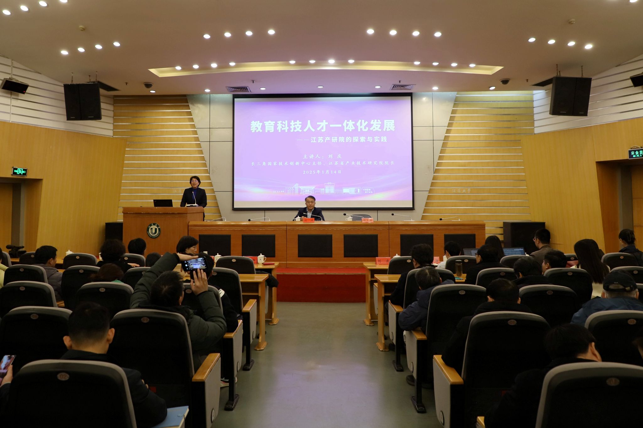 1月14日,长三角国家技术创新中心主任、江苏省产业技术研究院院长刘庆教授应邀为伟德官网师生作题为《教育科技人才“三位一体”促进高质量发展——长三角国创中心的探索与实践》的报告。报告会由校长邢卫红主持。副校长李红、王景全,部分职能部门科级以上领导干部,学院师生代表参加报告会。报告会前,校党委书记李洪波陪同刘庆一行参观了校史馆,深入了解学校的发展历程及近年来取得的成就。