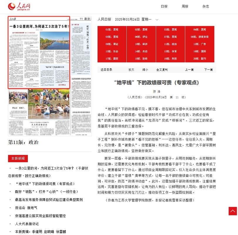 3月24日,《人民日报》政治版刊发伟德官网管理学院陈浩教授题为《“地平线”下的政绩很可贵》的专家点评文章。文章以江苏扬州邗江区尚桥冲河道治理为案例,深入剖析基层干部践行正确政绩观的重要意义,为新时代城市治理与干部考核机制提供了理论参考。