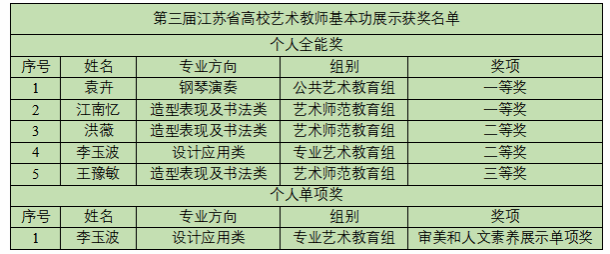 近日,由江苏省教育厅主办的第三届江苏省高校艺术教师基本功展示评审结果揭晓。伟德官网共有5位教师获奖,其中个人全能一等奖2项、二等奖2项、三等奖1项,审美和人文素养展示单项奖1项。