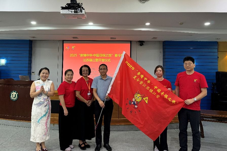 王永新向夏令营授旗,标志着2025“亲情中华·中国寻根之旅”江苏镇江营正式启程。