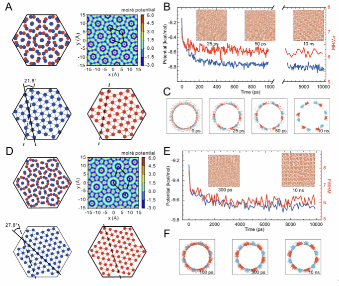 扭转双层范德华材料凭借其独特的摩尔超晶格效应,展现出奇特的物理特性,已成为量子器件设计的核心。传统研究集中于范德华材料体系,而这类体系需要人工精确堆叠才能实现电子态调控。水是地球上最丰富的物质之一,可以形成丰富的物质形态,属于非范德华材料,然而人类对其结构的认识还很有限,因此被科学杂志列为125个关键科学问题之一。在这种氢键主导的结构中能否形成稳定扭转结构,一直是未被探索的空白。研究首次发现在纳米受限环境中可自发形成具有摩尔超晶格的扭转双层冰(Twisted Bilayer Ice, TBI)。与需要人工扭转的范德华材料不同,扭转双层冰的两种稳定扭转构型(21.8°和27.8°扭转角)的形成依赖于氢键网络的结构自适应能力,为氢键摩尔材料的研究打开了新窗口。
