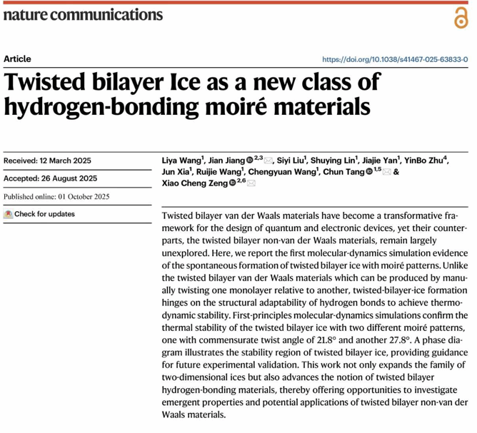 近日,土木工程与力学学院微纳米力学团队唐淳教授、王丽雅副教授与香港城市大学曾晓成教授团队合作,发现氢键主导的非范德华摩尔材料:魔角双层冰,在国际著名期刊Nature Communications上发表题为Twisted bilayer ice as a new class of hydrogen-bonding moiré materials的论文。伟德源自英国始于1946为第一完成单位,王丽雅为论文第一作者,香港城市大学江健博士、伟德源自英国始于1946唐淳和香港城市大学曾晓成为共同通讯作者。