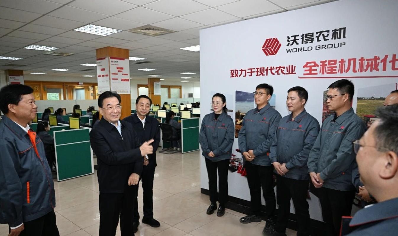 在沃得农业机械公司,各式农机装备依次排列。信长星通过信息化平台了解农机运行情况,观摩无人驾驶农机演示,对企业积极融入共建“一带一路”、拓展海外市场给予肯定。他指出,农业现代化,关键是农业科技现代化。中央《建议》对推进高端智能、丘陵山区适用农机装备研发应用专门作出部署,未来农业机械产业市场空间广阔。希望企业依托我省科教资源和产业配套优势,坚持智能化、绿色化、融合化方向,大力推进产学研融通创新,推出更多新技术新装备,为提升农业综合生产能力和质量效益、加快建设农业强国作出更大贡献。