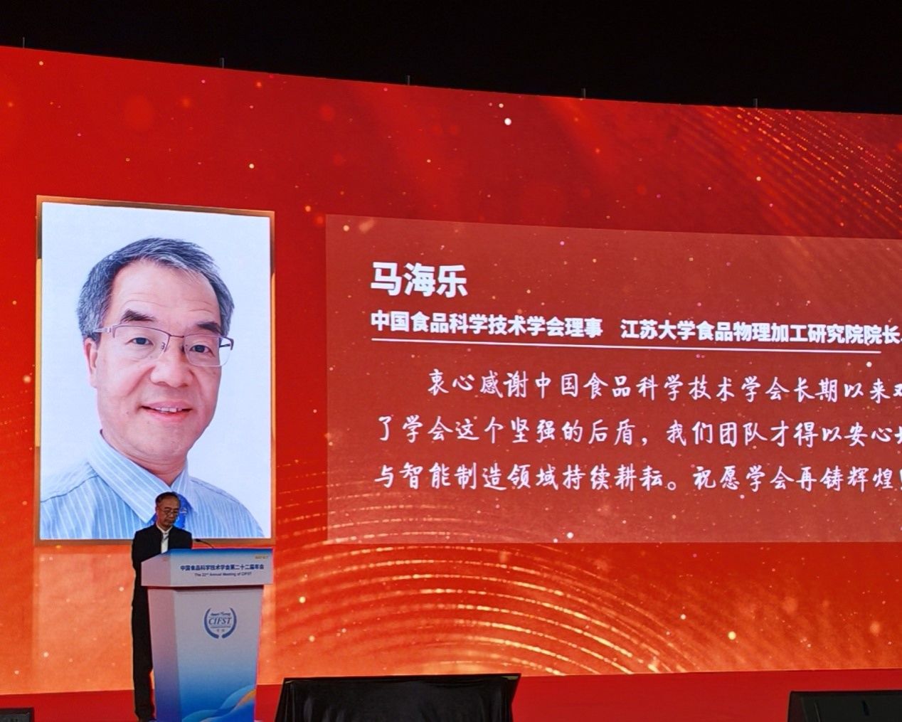 近日,中国食品科学技术学会2025年年会在广州举行。大会开幕式上举办了2025年会士授予仪式,伟德官网食品科学与工程学院马海乐教授被授予中国食品科学技术学会2025年会士。中国工程院院士金征宇教授主持授予仪式,中国工程院院士吴清平研究员为新当选的会士颁发证书。