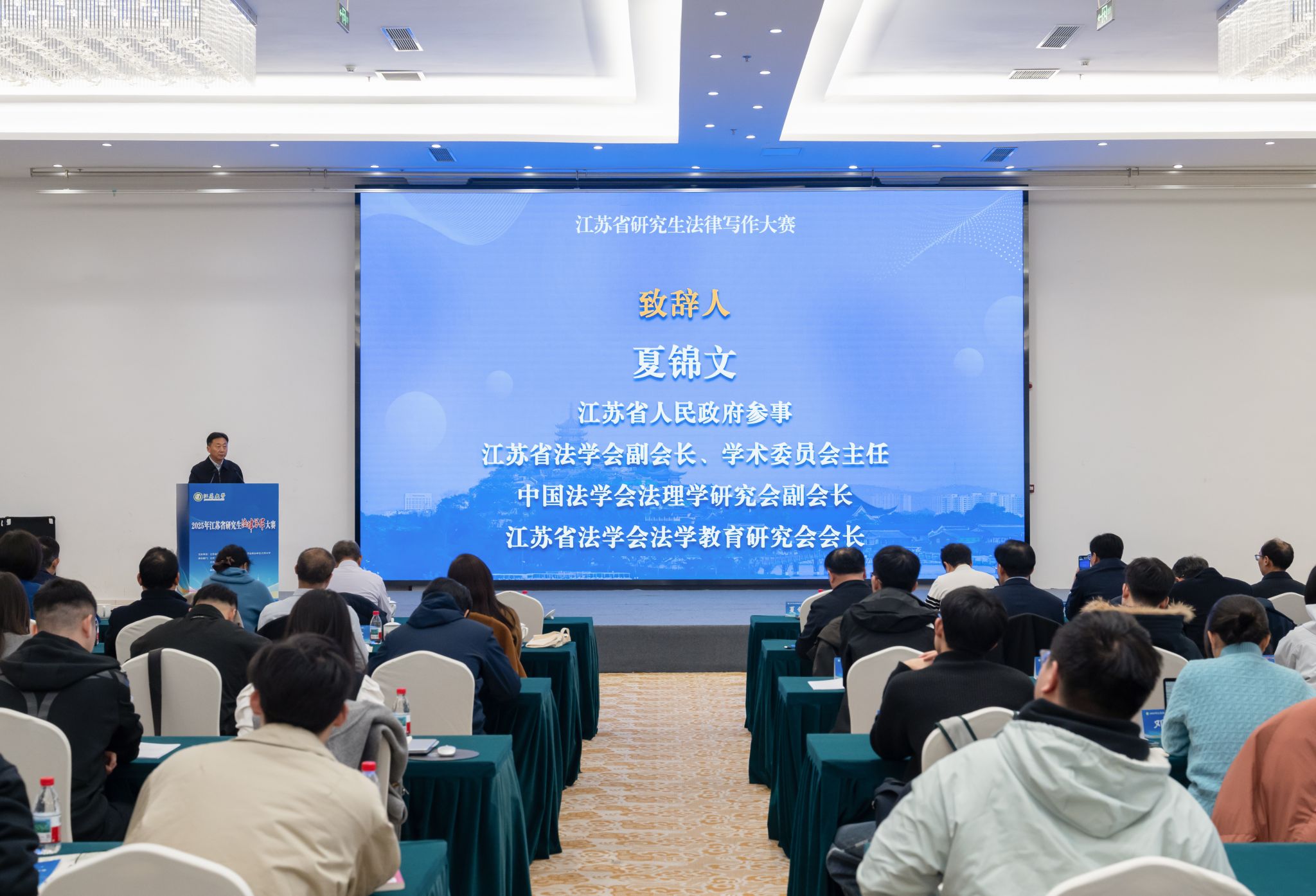 夏锦文在致辞中表示,大赛的举行是推动法学教育从“知识本位”向“能力与素养本位”深化、促进法学理论研究与法治实践深度融合的有力举措,希望参会师生立足江苏实践回应国家战略,面向职业需求提升综合素养,聚焦前沿问题贡献智慧力量,为形成中国特色、江苏辨识度的法学话语体系贡献青年才智。