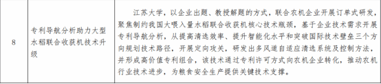 该案例聚焦提高清选效率、提升智能化水平、突破国际技术壁垒三大目标,与企业协同开展定向研发,成功开发出“多风道自适应清选系统及控制方法”,并围绕该技术形成高价值专利组合,通过专利许可方式实现向农机企业的有效转化,有力推动了农机行业技术进步,也为保障我国粮食安全生产提供了重要技术支撑。