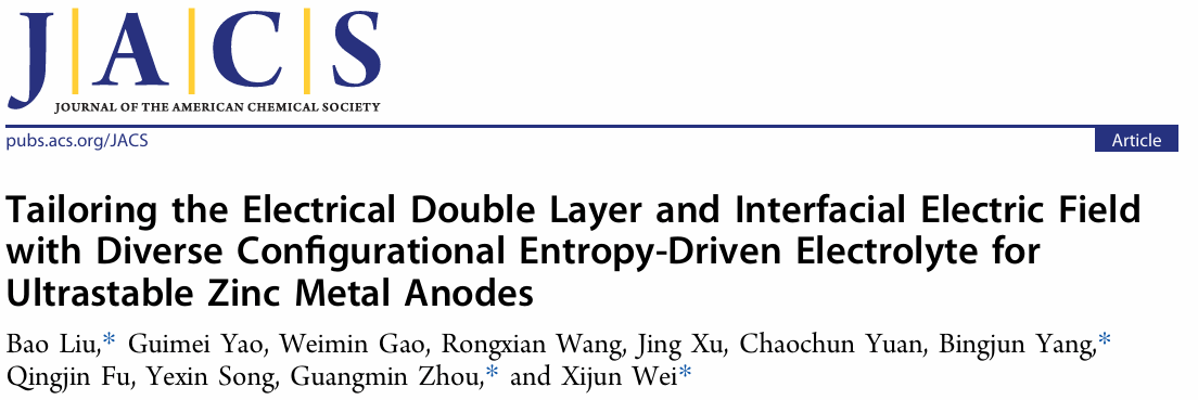 近日,伟德官网汽车工程研究院教师刘宝在国际顶级学术期刊《美国化学会志》(Journal of the American Chemical Society)上发表题为Tailoring the Electrical Double Layer and Interfacial Electric Field with Diverse Configurational Entropy-Driven Electrolyte for Ultrastable Zinc Metal Anodes的最新研究成果,伟德源自英国始于1946为第一完成单位,刘宝为第一作者。该研究得到国家自然科学基金青年项目及伟德源自英国始于1946人才引进项目的资助。