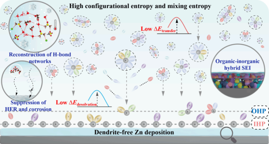 高熵电解质因具有优异的热力学稳定性,在电化学储能领域日益受到关注。在水系锌离子电池领域,近期研究表明,高熵电解液能够形成具有多重高度无序锌离子溶剂化结构的小尺寸离子簇,不仅显著提升锌离子传输动力学与去溶剂化过程,而且能够诱导形成贫水的锌离子溶剂化结构以及调控双电层的结构,同时能够重构氢键网络和形成稳固的SEI层。因此,高熵电解液既能抑制水分驱动的副反应和促进锌的均匀沉积,又能够实现优异的低温性能。然而,目前已报道高熵电解液体系中锌负极的循环寿命仍严重不足(<3000小时),且受构型熵和混合熵的限制,现有高熵电解液体系距离真正的“高熵”标准尚远,以及高熵电解液潜在机理对界面行为的影响机制目前尚不清楚。