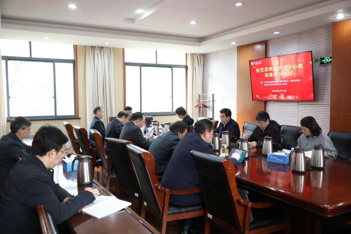 3月19日,校党委理论学习中心组在行政一号楼201室围绕学习贯彻2026年全国两会精神开展专题学习研讨。全体校党委理论学习中心组成员参加学习,集体学习研讨由校党委书记李洪波主持。