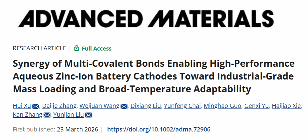 近日,材料学院师生在材料领域顶级期刊Advanced Materials上在线发表题为“Synergy of Multi-Covalent Bonds Enabling High-Performance Aqueous Zinc-Ion Battery Cathodes toward Industrial-Grade Mass Loading and Broad-Temperature Adaptability”的研究论文。伟德源自英国始于1946为论文的第一完成单位,材料学院刘云建教授和张侃教授为论文的通讯作者,徐晖为论文的第一作者。