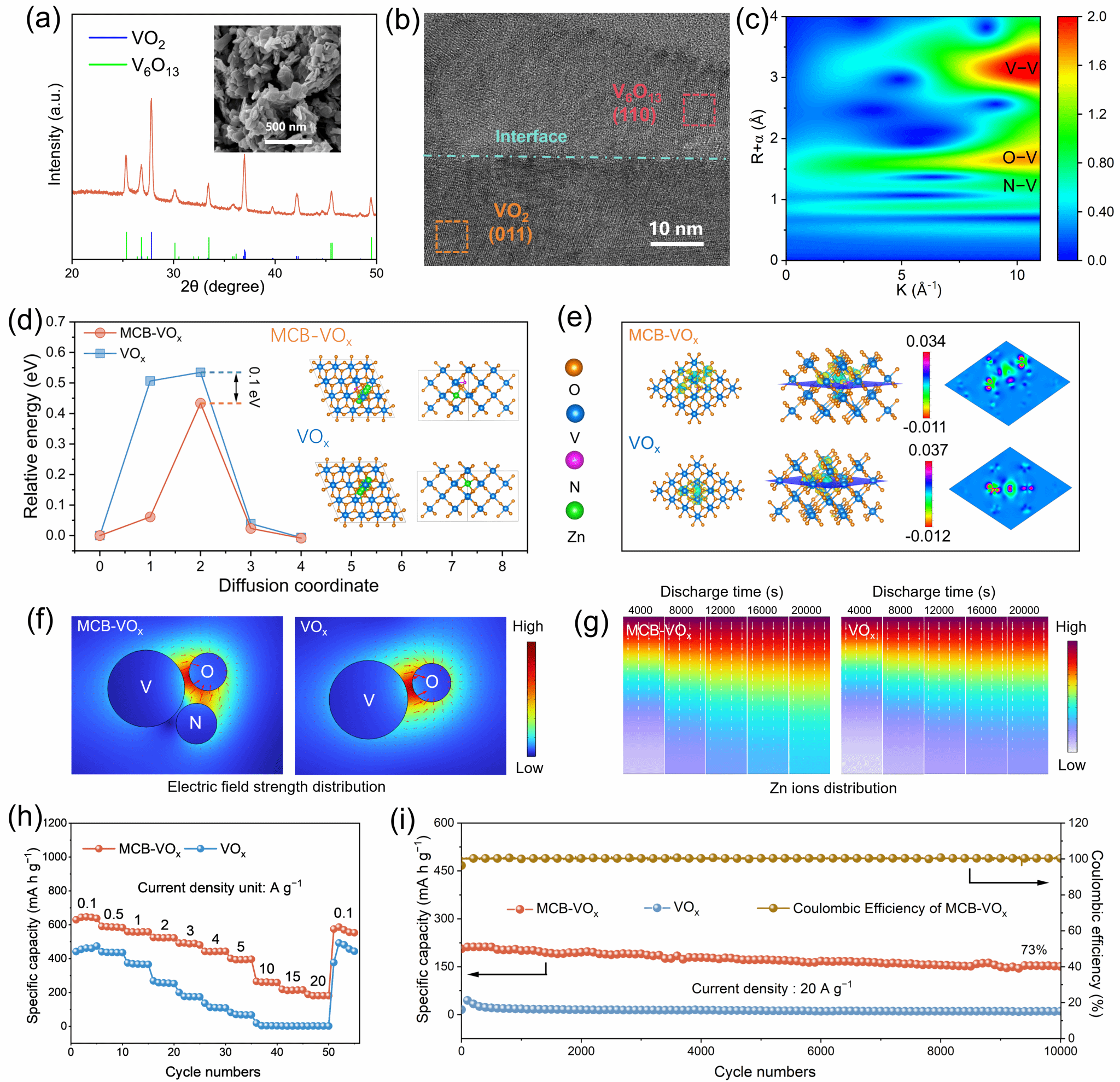 开发适用于工业应用条件的高性能正极材料,长期以来一直是水系锌离子电池领域面临的核心挑战。本研究创新性地提出了一种基于多共价键协同的全新设计策略,成功突破了这一技术瓶颈,有效解决了传统正极材料难以兼顾高性能与实用性的局限。通过在钒氧化物隧道结构中引入间隙氮离子,构建了独特的O−N−O与N−V共价键网络,其诱导产生的静电屏蔽、动态重构及结构钉扎效应,协同降低锌离子的扩散势垒,增加活性位点数量,并显著增强晶体结构的稳定性。性能测试表明,该材料在0.1 A g−1下实现624 mAh g−1的超高容量,在20 A g−1下循环10000次后容量保持率达73%;在高负载量(≥7 mg cm−2)及极端温度(0 ℃、60 ℃)条件下仍能保持优异性能,为水系锌离子电池的工业化应用奠定了基础。