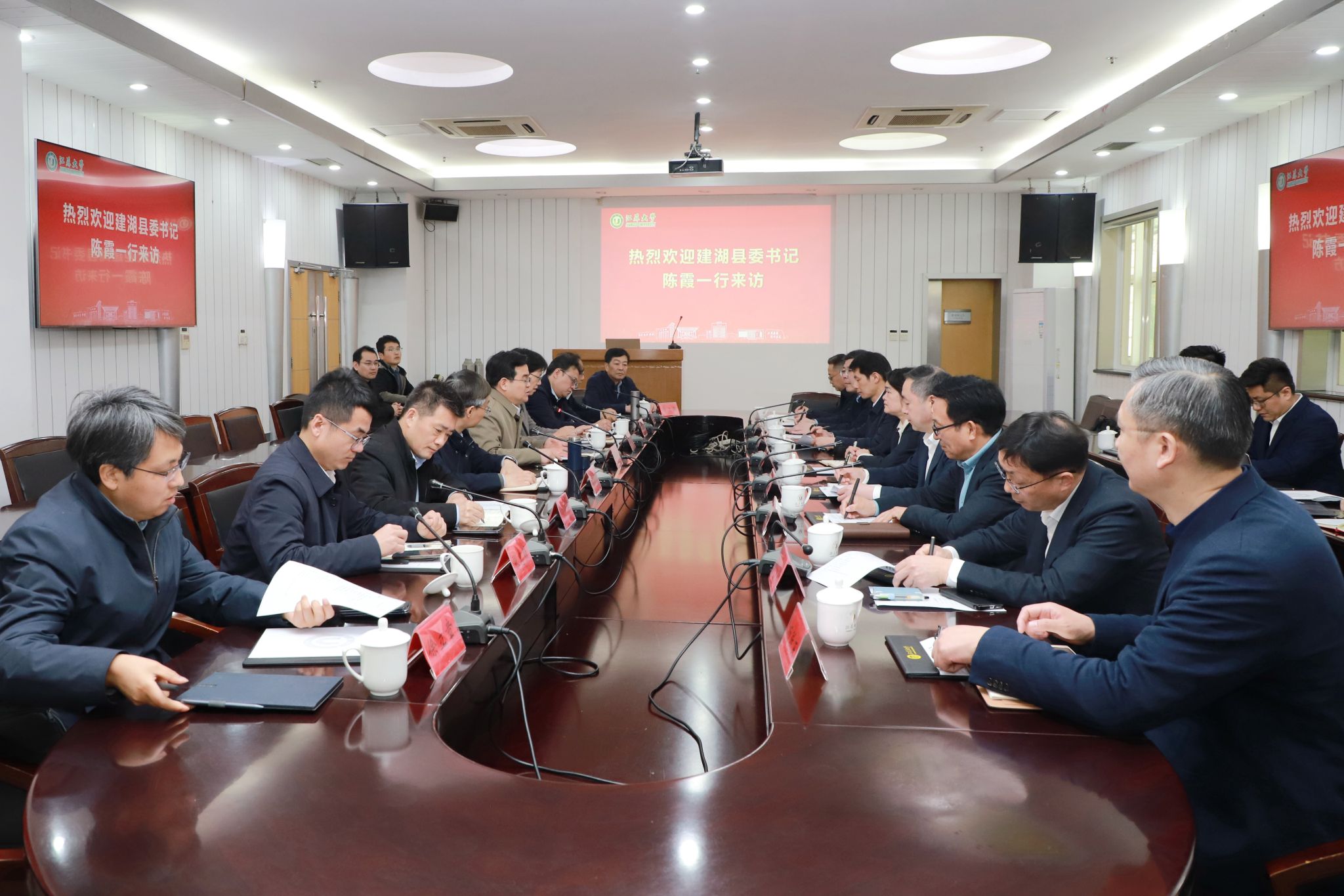 3月25日,建湖县委书记陈霞率队来校交流,校党委书记李洪波、副校长李红接待了陈霞一行。