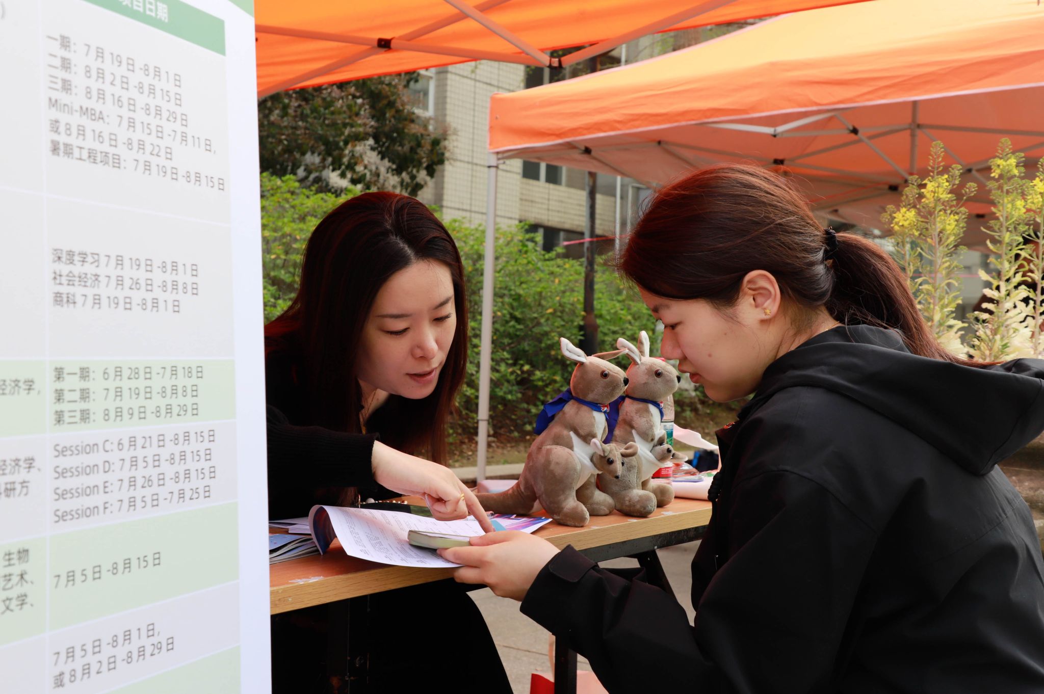 本次现场咨询会在三山楼教学区附近搭建户外展台,方便学子课间就近咨询、便捷对接。各参展单位为学生提供“一对一”精准指导服务,涵盖海外短期学习、实习实践、升学申请、外语培训等。