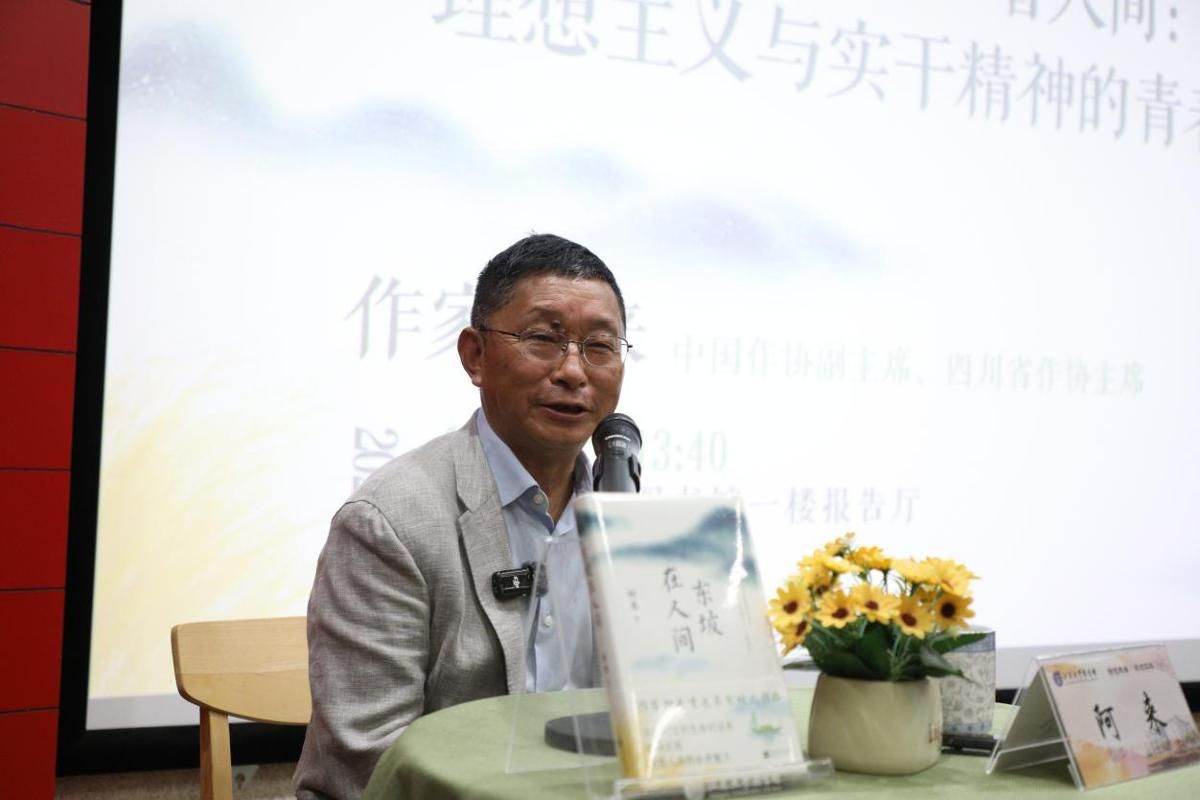 开幕式后,阿来携新作《东坡在人间》走进人文大讲堂,为师生作了题为《从“东坡”看人间:理想主义与实干精神的青春对话》的讲座。他以宏阔的历史视野与深邃的人文关怀,带领师生重走苏轼北归足迹,展开了一场跨越时空的精神对话。讲座中,阿来既展现了千古文人在逆境中坚守的理想之光,也诠释了其扎根生活、直面风雨的实干与担当。用一场跨越千年的精神相遇,展开了一次深刻的文学品读,为青年学子送上了珍贵的成长启示,引导他们心怀理想、脚踏实地,在青春路上既仰望星空,也躬身实干。