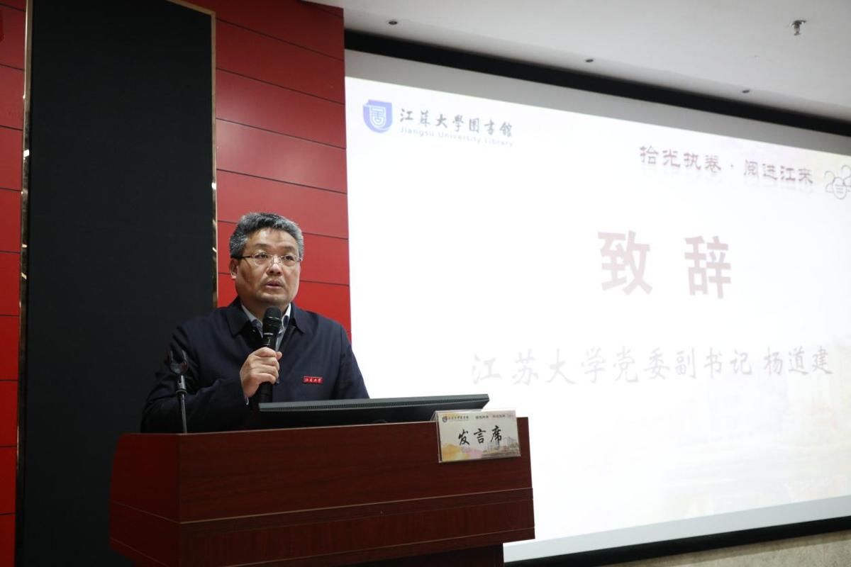 杨道建宣布读书节开幕并致辞,他肯定了图书馆在书香校园建设中发挥的重要作用和取得的积极成效,寄语全体师生以读书节为契机,与书为友、以读为乐,让阅读成为青春风尚;希望同学们从书籍中汲取力量、淬炼成长,不负韶华、不负时代,努力成长为有理想、有学问、有担当的新时代青年。