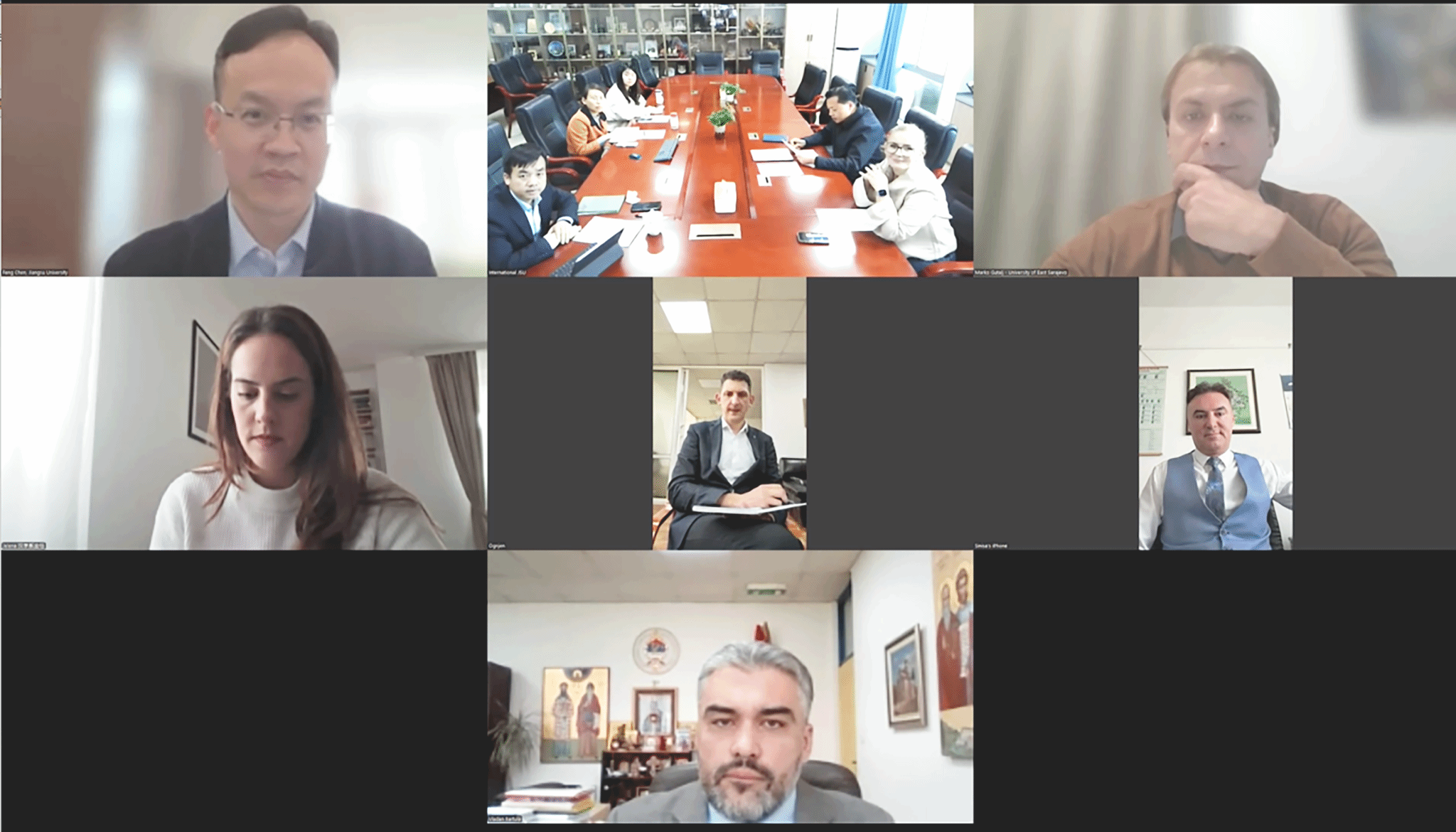 4月15日,学校与波黑东萨拉热窝大学举行视频会议。伟德官网党委常委、副校长陈峰,国际处相关人员和外教德拉加娜·奥斯蒂奇,东萨拉热窝大学副校长马尔科·古塔尔吉、哲学院及汉学系负责人出席会议。会议由伟德官网国际处处长崔勇主持。