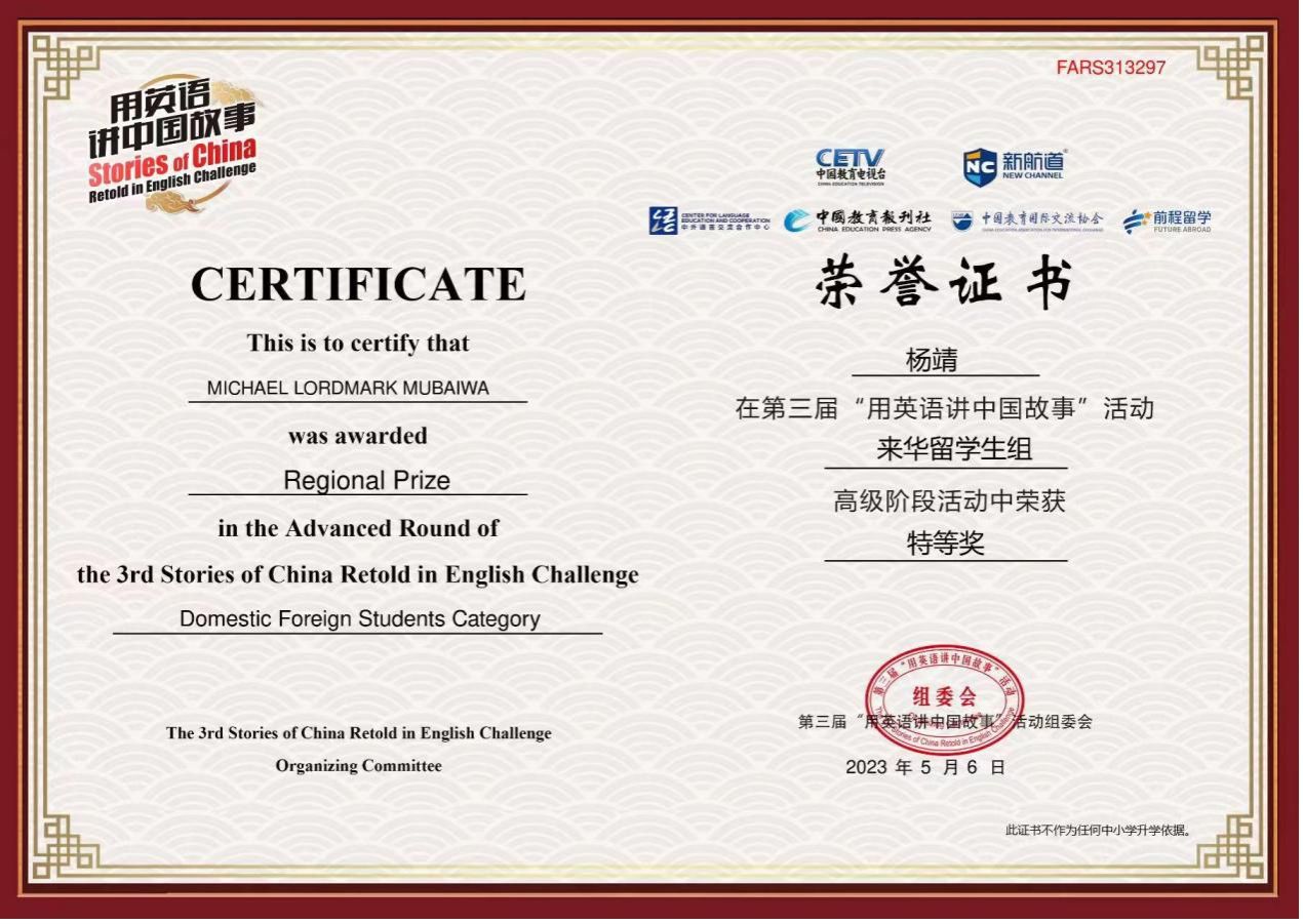 近日,伟德官网津巴布韦籍留学生杨靖在第三届“用英语讲中国故事”活动中获全国总决赛特等奖。