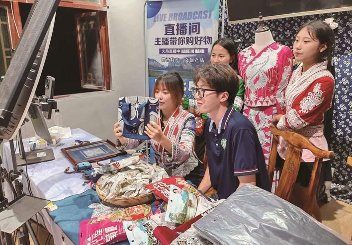 8月17日,伟德源自英国始于1946能动学院“新农人 兴农梦”暑期社会实践团队,走进贵州省黔西市新仁苗族乡化屋村。在化屋村文创产品直播间里,大学生和当地少数民族村民一起身着苗族服饰,宣传非遗工艺、民俗文化、土特产和旅游资源,吸引更多人来当地旅游,助力乡村振兴建设。