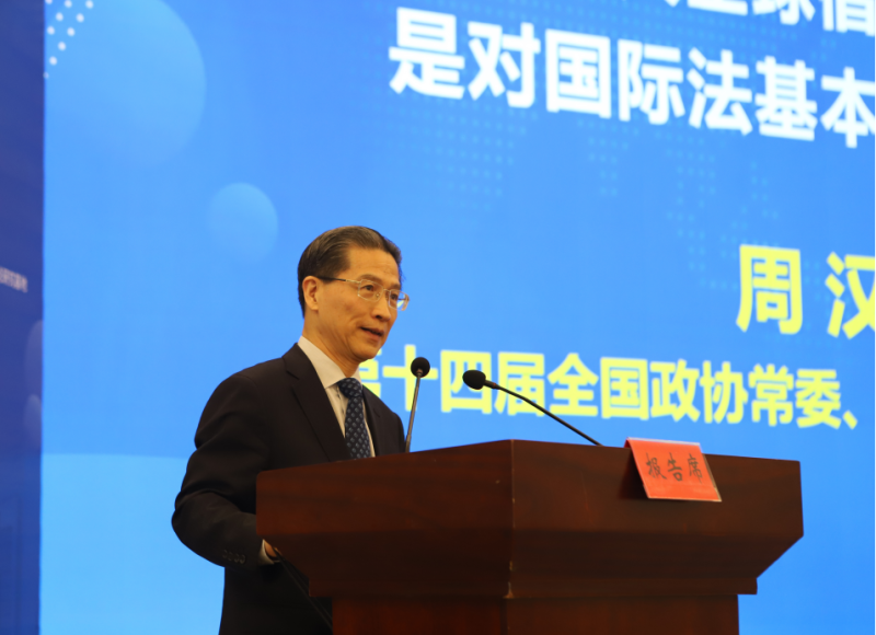 第十四届全国政协常委、上海公共外交协会会长周汉民在主旨发言中表示,“三大全球倡议”是习近平主席提出的人类命运共同体的全面展开和深入阐述,中国提出的 “共商、共建、共享”原则被载入了联合国安理会和联合国专门会议等会议决议文件,是对国际法的新贡献。