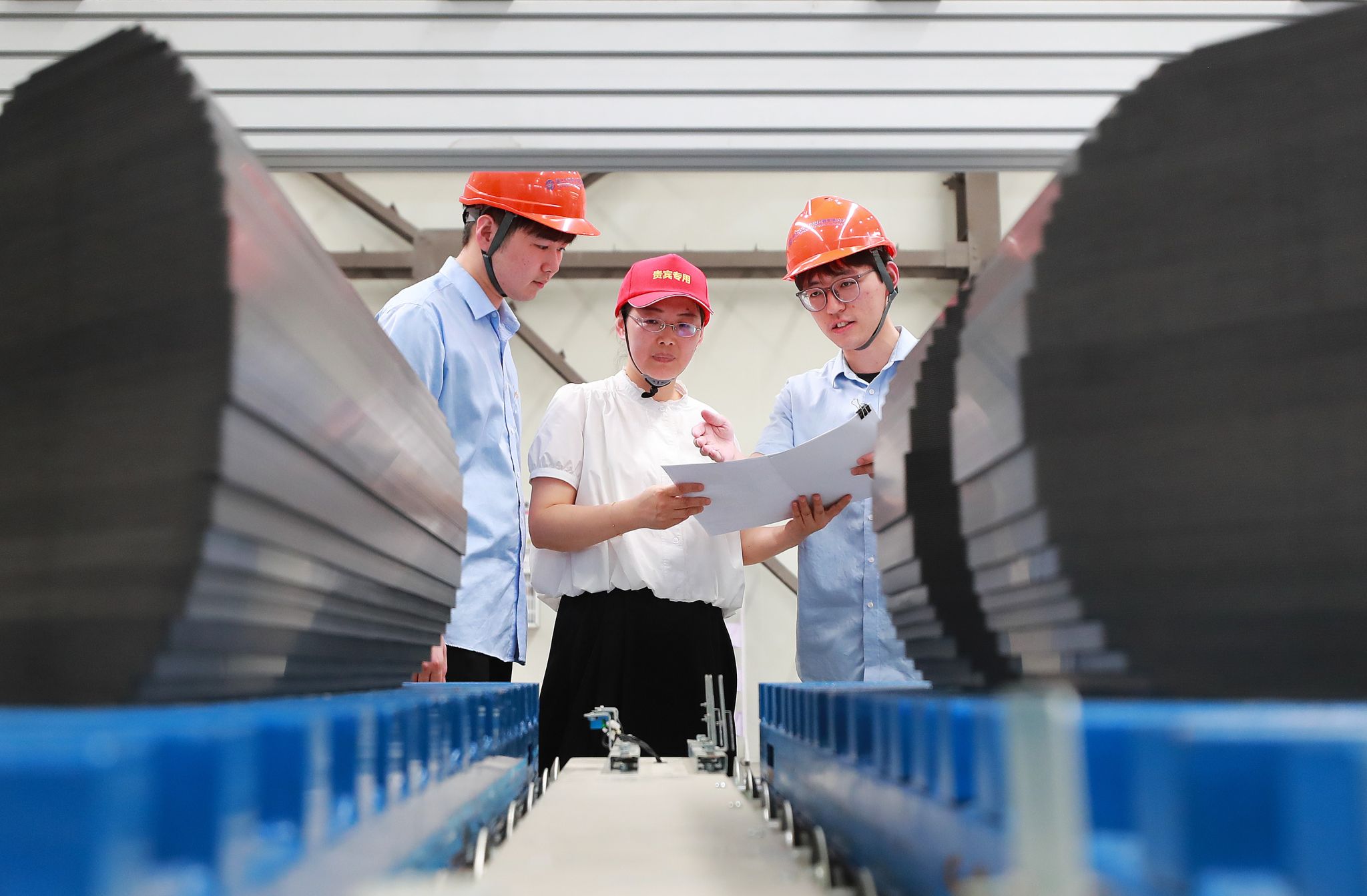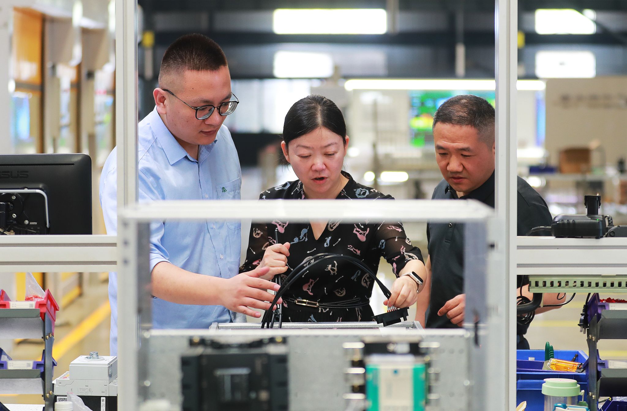 在江苏大全集团低压成套电气生产车间,伟德源自英国始于1946计算机科学与通信工程学院教师宋雪桦(中)、金华(右)与企业技术人员交流基于AI的自动化生产线检测技术。