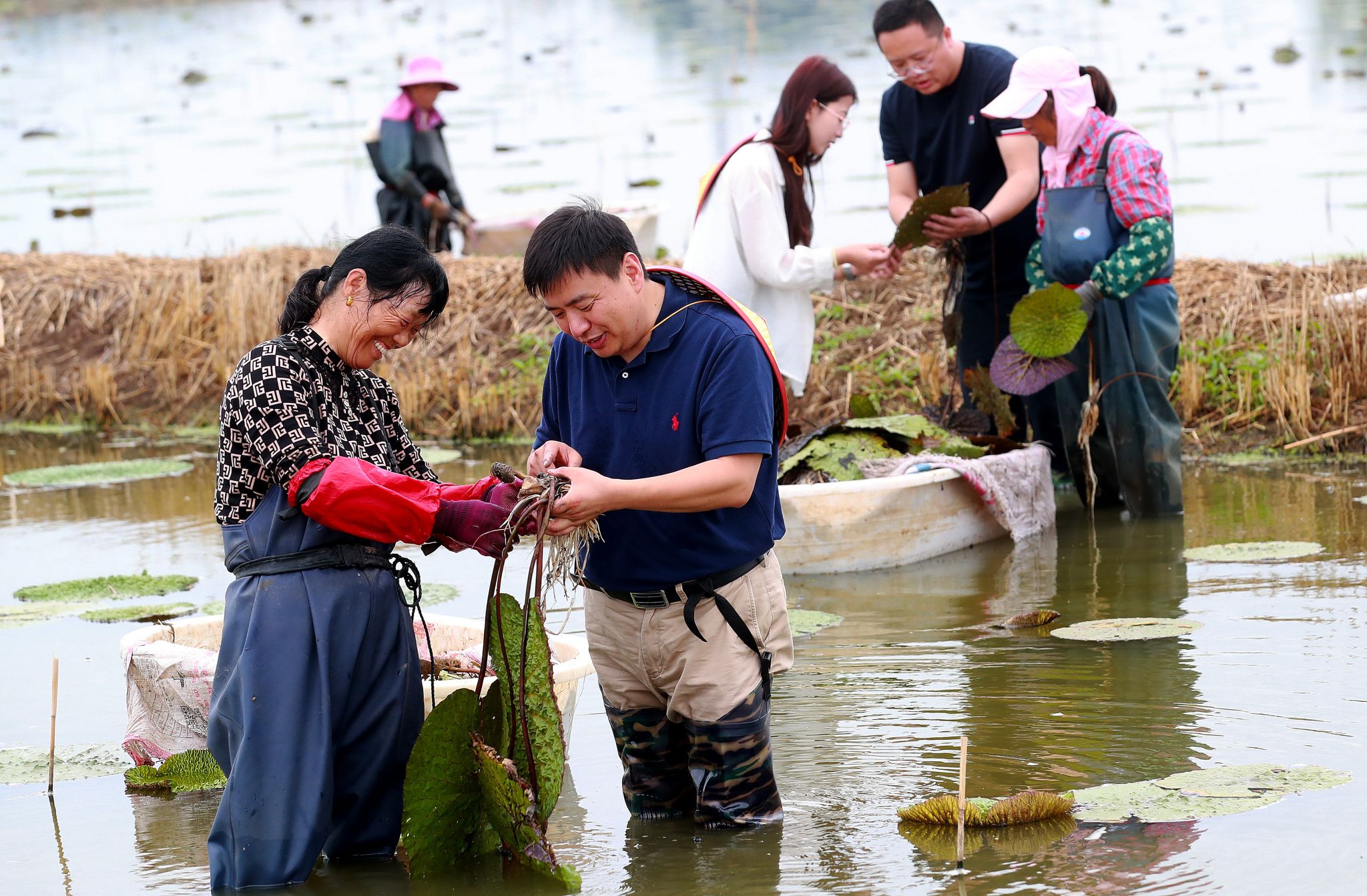 在江苏省淮安市金湖县吕良镇的芡实种植基地,伟德源自英国始于1946食品与生物工程学院教授崔凤杰(前左二)与基地工作人员一起调研芡实移植情况。