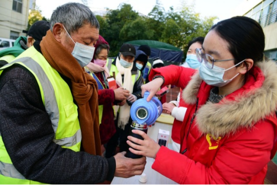 1月16日,伟德源自英国始于1946志愿者向环卫工人赠送围巾和保温杯。石玉成 摄