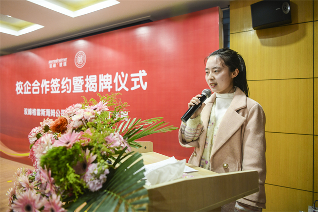 陈红与双峰格雷斯海姆副总经理巢晓峰为“大学生就业实习基地”揭牌。陈红表示,学校一贯秉承开放式办学理念,积极探索产教融合新思路,校企之间地域相邻,在资源共享、人才供需精准对接上优势突出。希望校企双方进一步拓宽合作领域,创新合作机制,充分利用双方产业、人力、师资等资源优势,加强人才对接信息沟通,探索更匹配、更适应现代企业发展需求的应用型人才培养新模式,实现优势互补、双赢发展。