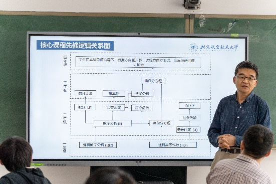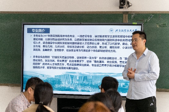 学院副院长马声明为各位同学梳理了数学与应用数学专业核心课程设置的逻辑关系,帮助各位同学建立整体性思维框架。马声明表示,学院鼓励学生交流讨论和根据个人兴趣探索学习。基础数学系系主任戴蔚介绍了学院基础数学系的基本情况,详细讲解了数学与应用数学专业的专业设置、培养特点、课程体系和未来发展,结合分析与方程的具体研究方向,点明了专业课程与基础研究的衔接点。基础数学系教师漆毅、薛玉梅、王宝山、高鹏、贺慧霞、张继龙、徐丽、陈伊凡、沈良明、朱政介绍了各自的研究方向,并欢迎感兴趣的同学进一步交流。