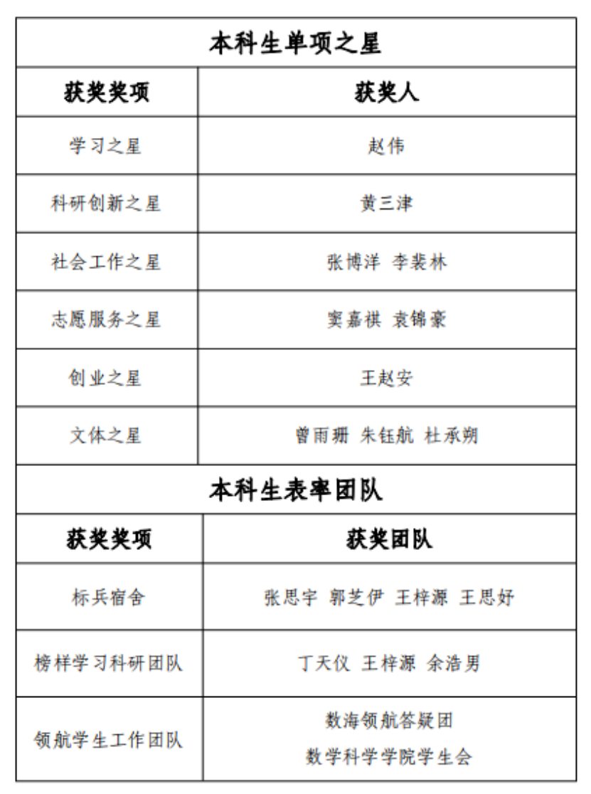 11月16日,2022年“数学之星”评选正式启动。经“数学之星”评审委员会函评与学院内公示, 赵伟、黄三津、窦嘉祺、王浩天、姜亦申、刘泽蕙等15人获评单项之星,数海领航答疑团等6支团队获评表率团队,许多、李泽彤、岳泽阳、陈永鑫、于晟伟、穆欢等29人获评优秀奖,kaiyun开云官方网站学生会等6支团队获评优秀团队。